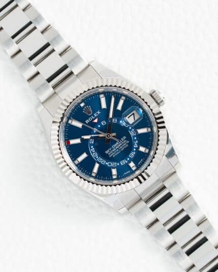 The Rolex Sky-Dweller 326934 with a blue dial and Oyster bracelet is a masterpiece of horological innovation, blending sophisticated design with advanced functionality for