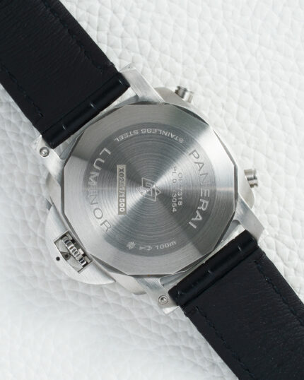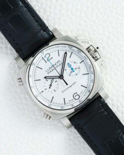 The Panerai Luminor Chronograph PAM01218 with its striking white dial and 44mm stainless steel case is a bold statement of Italian design and Swiss watchmaking, blending