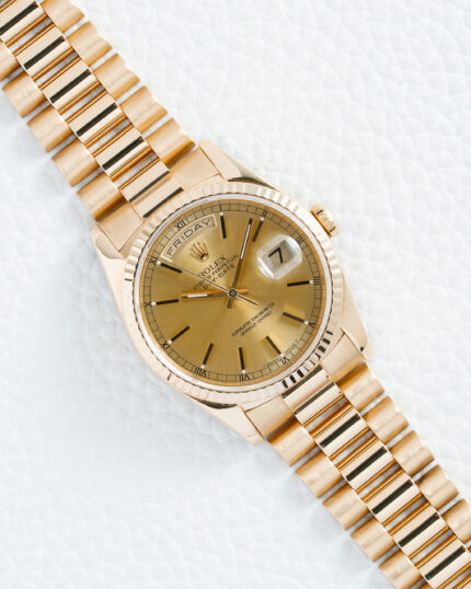 The Rolex Day-Date 18038 Champagne Dial Yellow Gold is a timeless masterpiece that exudes luxury and class. Known as the