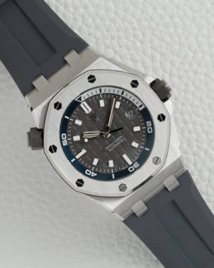 The Audemars Piguet Royal Oak Offshore Diver Ref. 15720ST in stainless steel with gray “Méga Tapisserie” dial and matching gray rubber strap represents the pinnacle of luxury dive