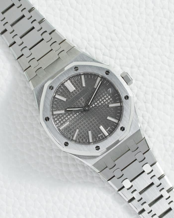 Theย Audemars Piguet Royal Oak 15510STย with itsย sophisticated rhodium dialย andย stainless steel constructionย is the quintessential expression of luxury sports watch design, blending the iconic Gerald Genta architecture with contemporary aesthetics in a 41mm timepiece that has defined an entire genre since 1972. This horological masterpiece features the Royal Oak’s signatureย octagonal bezel secured with eight hexagonal screws, perfectly contrasting with the alternatingย brushed and polished surfacesย of the case that showcase AP’s legendary finishing techniques. Theย stunning rhodium-toned “Grande Tapisserie” dialย creates a mesmerizing play of light through its intricate guillochรฉ pattern, offering a cooler, more contemporary aesthetic compared to traditional blue or black variants, while theย applied white gold hour markers and matching Royal Oak handsย ensure optimal legibility beneath the anti-reflective sapphire crystal. Powered by the new-generation self-windingย Caliber 5900, this in-house movement offers an improvedย 60-hour power reserveย and enhanced precision, with its beautifully finished mechanics visible through the sapphire caseback. Theย integrated stainless steel braceletย with its distinctive tapered links provides unparalleled comfort and a seamless aesthetic, secured by an AP-stamped folding clasp. Every detail reflects Audemars Piguet’s uncompromising attention to craftsmanship, from theย perfectly beveled edgesย to theย mirror-polished screw headsย andย satin-brushed surfaces. Theย rhodium dial variantย offers exceptional versatility, serving as a perfect neutral backdrop for the bezel’s brilliance while maintaining a clean, modern aesthetic that transitions seamlessly from casual to formal wear. As the latest evolution of the original design, thisย Royal Oak 15510STย maintains all the collection’s distinctive features while incorporating updated mechanics and proportions. Its perfect balance ofย sporty elegance and haute horlogerie sophisticationย makes this reference one of the most versatile and sought-after versions in the Royal Oak collection, representing the ultimate expression ofย luxury sports watch designย that continues to captivate collectors and enthusiasts worldwide with its timeless appeal and technical excellence.