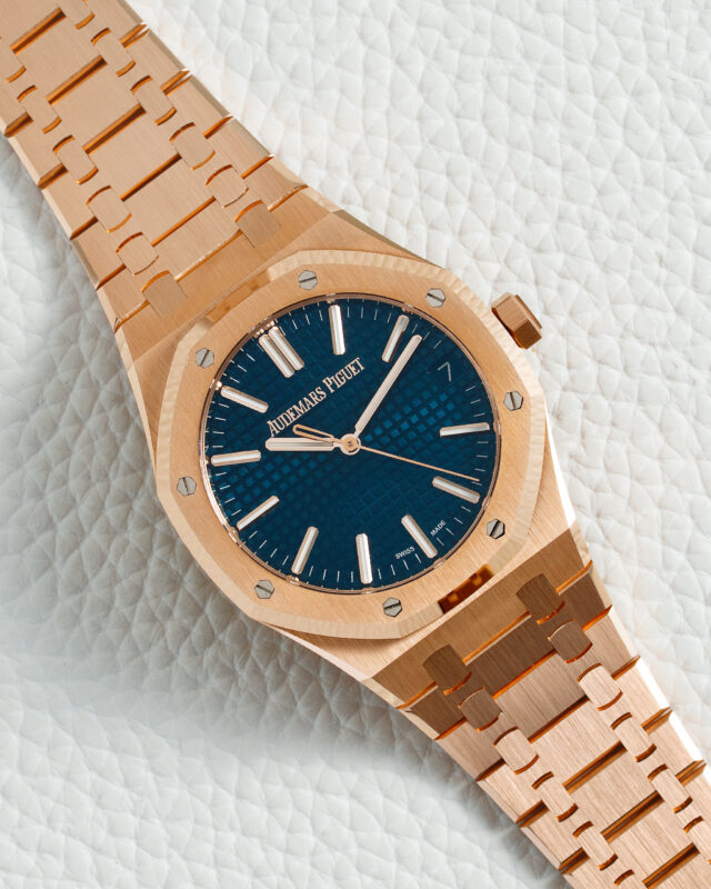 The Audemars Piguet Royal Oak Offshore Chronograph 26470OR.OO.A125CR.01 is a masterful blend of luxury and technical prowess, featuring an 18k rose gold case that exudes sophistication and a striking gray “Méga Tapisserie” dial with its signature textured pattern that creates captivating light reflections. This 42mm timepiece boasts a highly functional chronograph display with three black sub-dials arranged in a distinctive layout: a 30-minute counter at 9 o’clock, 12-hour counter at 6 o’clock, and small seconds at 12 o’clock, complemented by a date window positioned between 2 and 4 o’clock for optimal balance and readability. The watch is secured with a black rubber strap that offers exceptional comfort and sporty elegance, paired with an 18k rose gold AP folding clasp that maintains the timepiece’s luxurious appeal. Powered by the high-performance Caliber 3126/3840 self-winding movement, this chronograph delivers precision timekeeping with its column-wheel mechanism and impressive 50-hour power reserve, visible through the exhibition caseback that showcases the meticulously finished movement. The iconic octagonal bezel, secured by eight polished white gold screws, honors the Royal Oak’s legendary design, while the black ceramic pushpieces and crown guard provide a striking modern contrast. Water-resistant to 100 meters, this Offshore maintains its sporty character while offering uncompromising luxury. The harmonious combination of warm rose gold, cool gray dial, and black rubber strap creates a versatile aesthetic that transitions effortlessly from casual daytime wear to sophisticated evening occasions. A true collector’s piece, this Royal Oak Offshore Chronograph represents Audemars Piguet’s unwavering commitment to pushing boundaries in both technical innovation and aesthetic design, resulting in a timepiece that is as mechanically impressive as it is visually commanding. With its perfect balance of rugged functionality and refined elegance, this watch stands as a testament to AP’s mastery of luxury sports watchmaking and its ability to create instruments that are equally at home in the boardroom or on adventurous