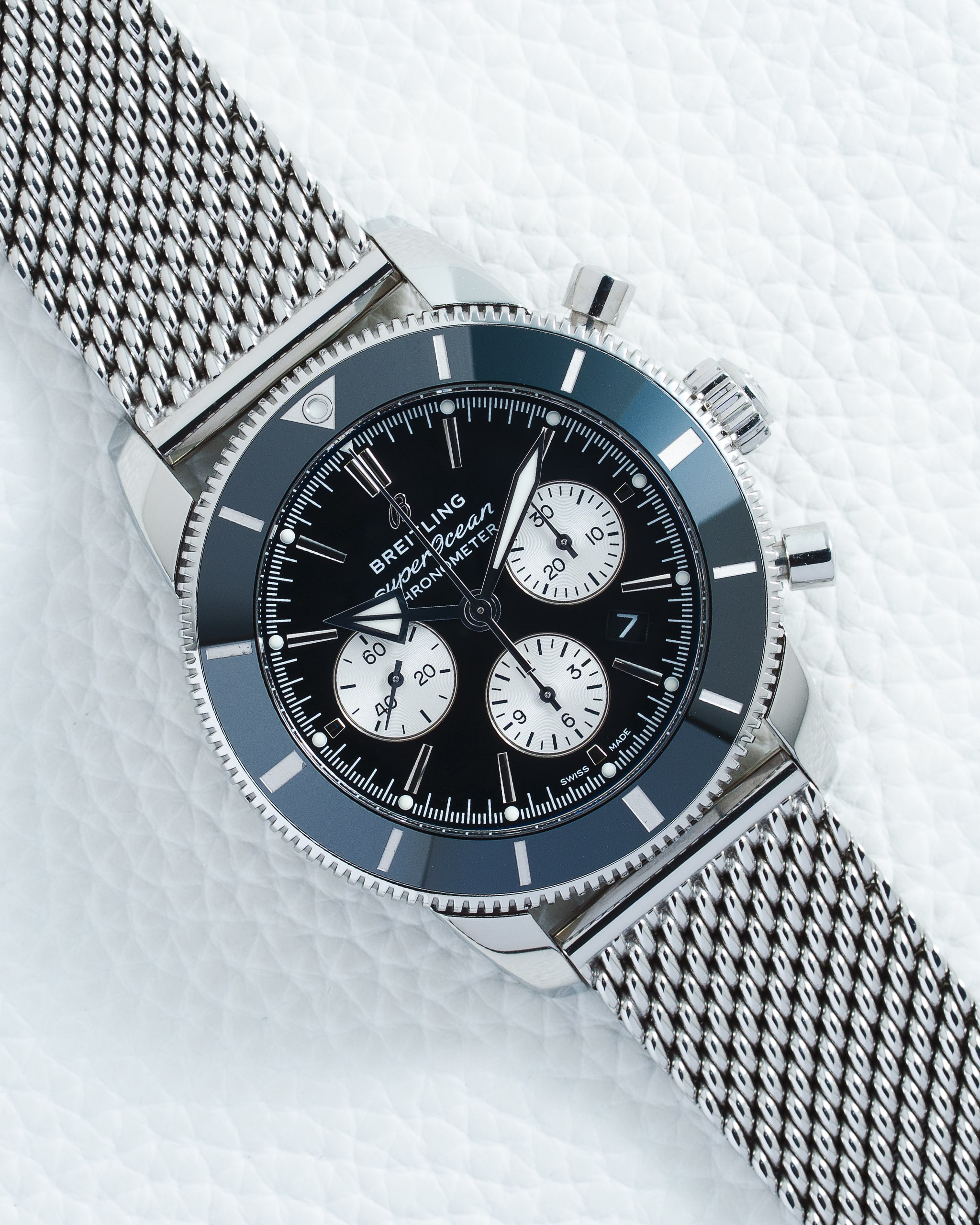 The Breitling Superocean Heritage II Chronograph 44 AB0162121B1A1 is a stunning tribute to the brand’s iconic 1957 diver, masterfully blending vintage-inspired design with cutting-edge chronograph technology and a sporty, modern execution on a rubber strap. This 44mm stainless steel timepiece features a unidirectional rotating bezel crafted from scratch-resistant black ceramic, with raised numerals and hour markers for a sophisticated, dimensional look that ensures exceptional legibility. The black dial is protected by a domed sapphire crystal with glareproof treatment on both sides, creating a warm, vintage feel while offering modern protection, and is enhanced by applied hour markers and broad triangular hands generously filled with luminescent material for optimal readability in any light. At its heart beats the Breitling Manufacture Caliber 01, an in-house automatic chronograph movement renowned for its reliability and performance, offering a robust 70-hour power reserve and COSC chronometer certification for exceptional precision. The chronograph function is elegantly displayed with three snailed sub-dials for a 30-minute, 12-hour, and small seconds counter, while a discreet date window sits at 4:30. The watch is presented on a black rubber strap that perfectly complements the monochromatic design, offering exceptional comfort and durability for an active lifestyle. The strap is secured by a stainless steel folding clasp and features Breitling’s innovative strap interchangeability system, allowing for easy customization without the use of tools. With a water resistance of 20 bar (200 meters / 660 feet) , the Superocean Heritage II Chronograph 44 is as capable in the water as it is elegant on land, making it the perfect synthesis of heritage aesthetics, modern engineering, and sporty versatility for the discerning collector who demands a diver with true character.