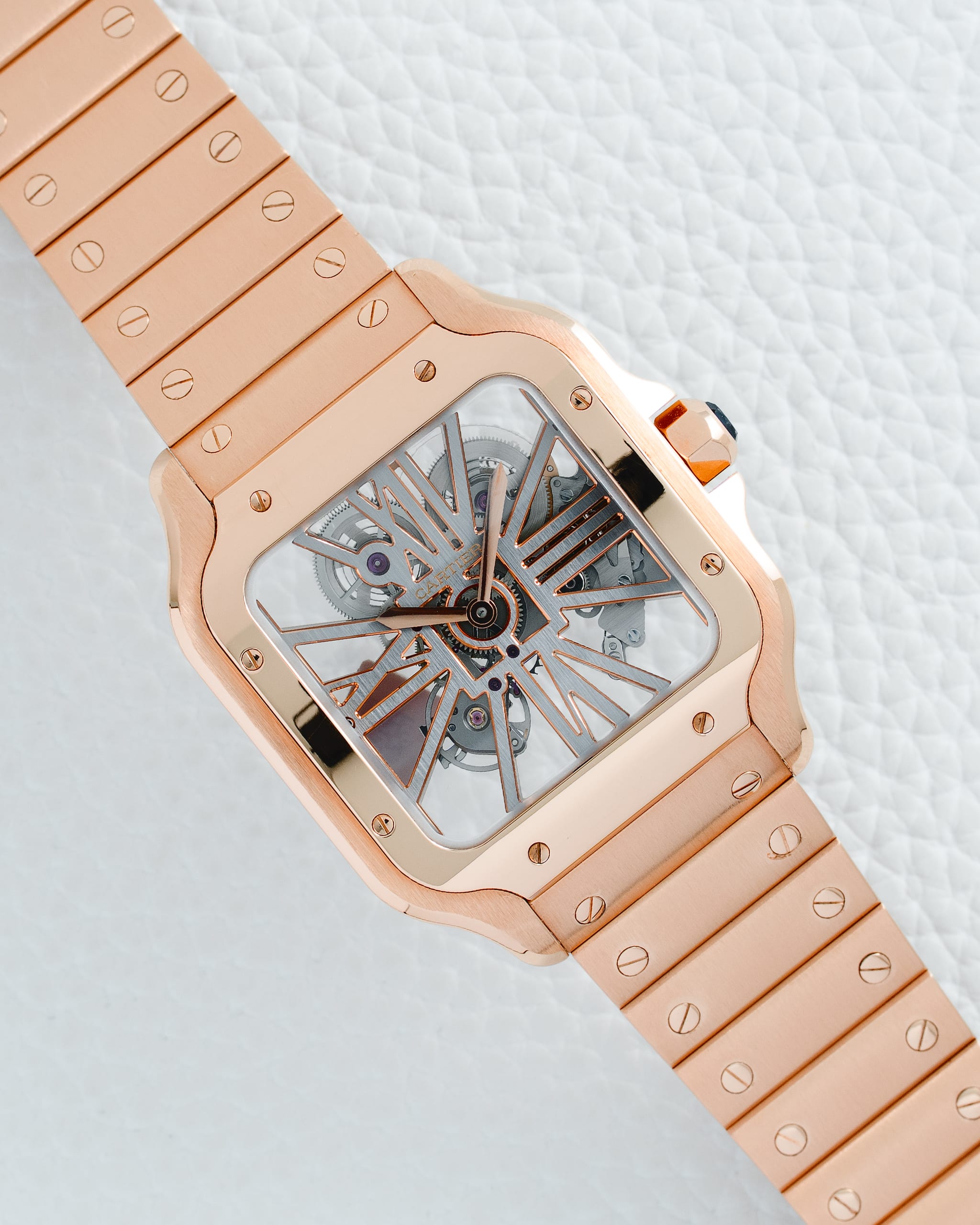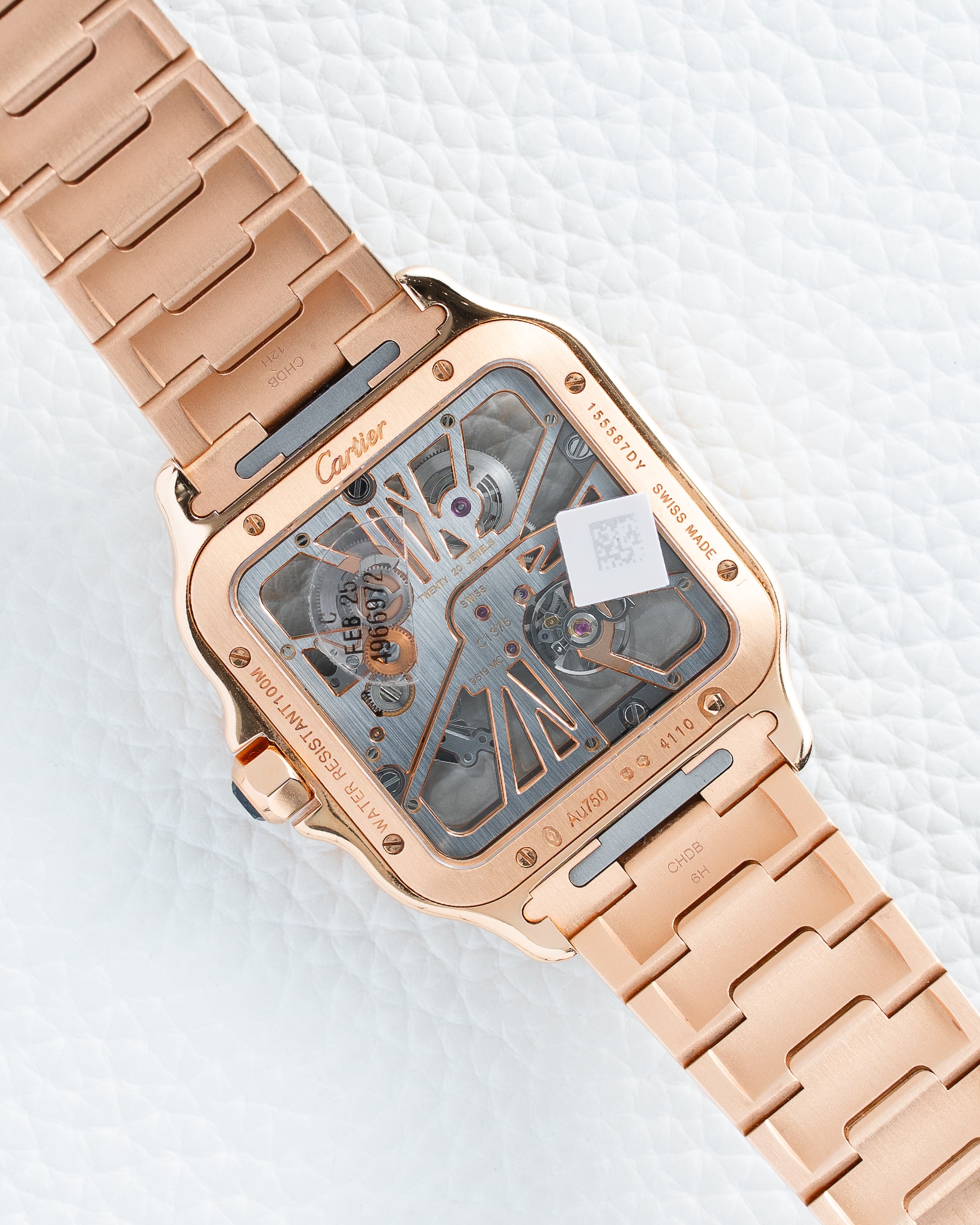 Theย Cartier Santos de Cartier Skeleton Ref. WHSA0016ย is a breathtaking masterpiece of horological architecture, representing the pinnacle of the Maison’s technical artistry and its legendary design heritage. This exceptional timepiece, part of the “large model” collection, features aย 39.7mm caseย crafted from solidย 18K rose gold (750/1000)ย , which frames one of the most distinctive dials in contemporary watchmakingย . The dial is completely skeletonized, offering a mesmerizing view of theย manufacture mechanical movement with manual winding, calibre 9619 MCย , where the Roman numeralsโthe very signature of Cartierโare not simply printed on a surface but are ingeniously integrated as part of the movement’s structure, carved directly into the skeletonized bridgesย . This rare feat of engineering transforms timekeeping into a visual spectacle, with the polished gold sword-shaped hands gliding gracefully over the intricate, openworked architectureย . Powering this display is the meticulously finishedย in-house Caliber 9619 MCย , composed ofย 138 parts including 20 jewels, oscillating at a frequency of 28,800 vibrations per hour and delivering a substantialย 72-hour power reserveย . The watch is secured by a beautifully integratedย 18K rose gold braceletย featuring Cartier’s innovativeย “SmartLink” adjustment systemย for a perfect fit, and is also accompanied by an additionalย black alligator leather strapย fitted with an interchangeableย 18K rose gold folding buckleย . Both the bracelet and the strap utilize the convenientย “QuickSwitch” system, allowing for effortless changes to suit any occasionย . The design is anchored by the iconic details of the Santos lineage, including theย rose gold heptagonal crownย adorned with aย faceted blue sapphireย and a robust case withย 100 meters of water resistance, protected by scratch-resistant sapphire crystals on both the front and display backย . A true icon for the discerning collector, theย Santos Skeleton WHSA0016ย is not merely a watch but a wearable work of art that pays homage to Louis Cartier’s original 1904 creation for aviator Alberto Santos-Dumont, now reimagined for the 21st century with unparalleled technical distinction and timeless eleganceย .ย Key specifications:ย 39.7mm 18K rose gold case; skeletonized dial with integrated Roman numeral bridges; manual-wind Cartier Caliber 9619 MC; 72-hour power reserve; 18K rose gold bracelet with SmartLink system and additional alligator strap with QuickSwitch system; 100m water resistance; sapphire crystal front and backย .