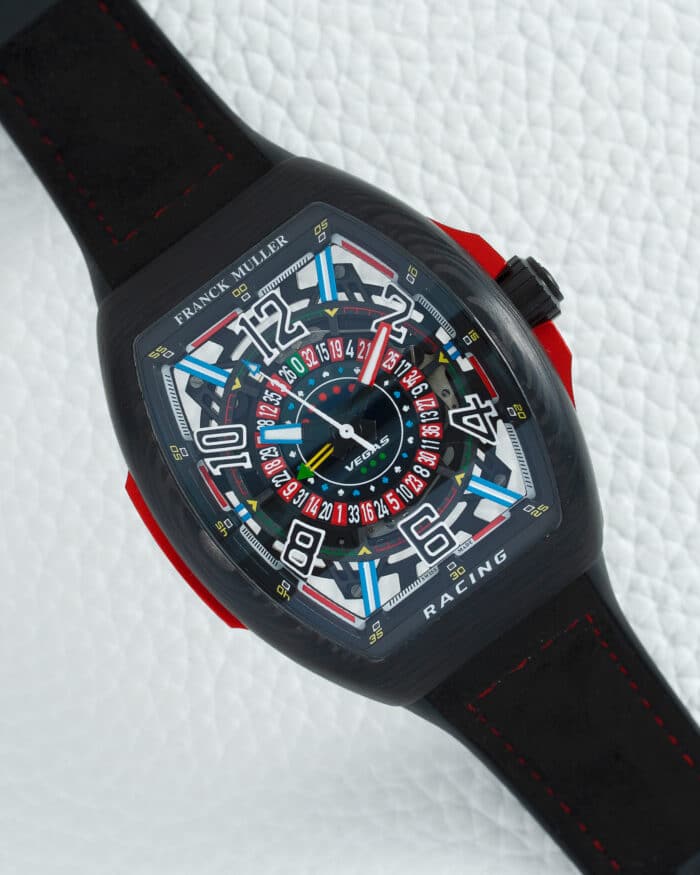 Theย Franck Muller Carbon Racing Vegas Collection, created in celebration of the 2023 Las Vegas Grand Prix, is a bold fusion of haute horlogerie, cutting-edge materials, and the electrifying spirit of Sin City, resulting in a timepiece that is as technologically advanced as it is visually captivating. This exclusive model features aย revolutionary case sculpted from 150 layers of compressed carbon fiber, a material revered in aerospace and motorsport for its exceptional strength-to-weight ratio, offering unparalleled durability and a featherlight feel on the wrist, with each case requiring an extremely complex and delicate machining process that underscores Franck Muller’s pioneering vision. The dial is a dynamic tribute to Las Vegas, featuringย vibrant colors directly inspired by the iconic “Welcome to Fabulous Las Vegas” sign, while the centerpiece is aย functional roulette wheelย withย spinning handsย that add an element of playful animation and chance, perfectly capturing the city’s legendary casino energy. This high-complication display is housed within Franck Muller’s signatureย Cintrรฉe Curvex case shape, masterfully reinterpreted in modern carbon, and protected by aย sapphire crystalย that offers a clear view of the intricate mechanics. The watch is powered by aย sophisticated automatic movement, meticulously finished and engineered to drive both the timekeeping functions and the engaging roulette complication. Paired with aย technical rubber strapย orย integrated carbon braceletย for enhanced sportive aesthetics, this timepiece is designed for maximum comfort and impact. Every detail, from theย luminescent indexesย to theย precision of the spinning roulette, reflects Franck Muller’s unwavering commitment to innovation, luxury, and theatrical design. This Carbon Racing Vegas piece is more than a watch; it is a wearable souvenir of a monumental sporting event and a testament to boundary-pushing craftsmanship, designed for the collector who seeks a conversation piece that embodies the thrill of racing, the glamour of Vegas, and the avant-garde spirit of Franck Muller.