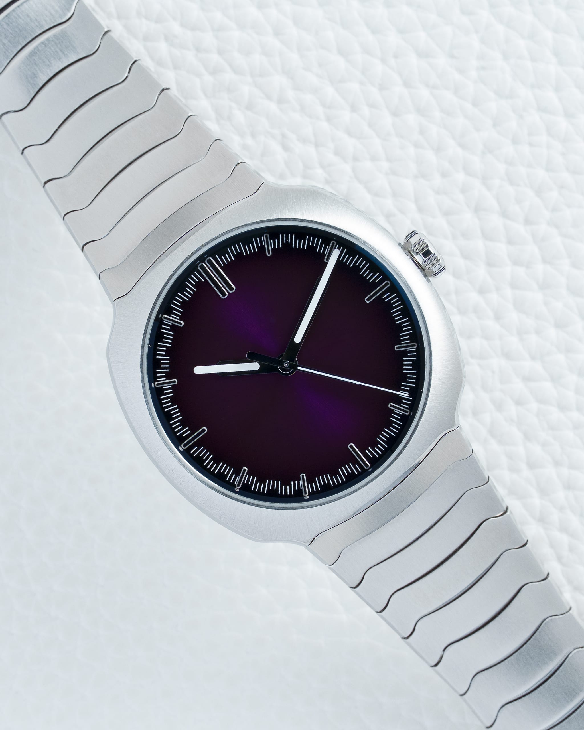 Theย H. Moser & Cie. Streamliner Centre Seconds Purple Haze 6201-1201ย is a masterful fusion of minimalist design and technical prowess, representing a hypnotic new chapter in the acclaimed Streamliner collection with its captivatingย Purple Haze fumรฉ dialย and integrated stainless steel constructionย . This 40mm timepiece features aย cushion-shaped, ergonomic caseย that flows seamlessly into a meticulously craftedย integrated mono-link steel braceletย with alternating brushed and polished surfaces, offering exceptional comfort and a fluid silhouette that pays homage to the aerodynamic design of 1920s and 30s Streamliner styleย . The dial is the undeniable star, presenting aย gradient “fumรฉ” finishย in an intense violet that subtly shifts to reveal blue hues, all while theย H. Moser & Cie. logo is applied in transparent lacquer, appearing as a secret signature that enhances the watch’s pure, uncluttered aestheticย . Powered by the in-houseย automatic calibre HMC 201, this movement boasts aย 72-hour power reserve, a fully skeletonized 18k gold rotor, and partially openworked bridges with a sleek grey-toned finish, all visible through the transparent sapphire casebackย . The applied three-dimensional indices and faceted hour and minute hands are fitted withย Globolightยฎ inserts, a ceramic-based material infused with Super-LumiNova, ensuring superb legibility day or nightย . Water-resistant toย 12 ATM (120 meters), the Streamliner Purple Haze is as durable as it is elegant, equally at home under water or at a formal soirรฉeย . This limited-production piece is a testament to H. Moserโs ability to create a timepiece of extraordinary depth and character, offering discerning collectors a perfect synthesis of avant-garde color, impeccable craftsmanship, and uncompromising Swiss watchmaking artistry.