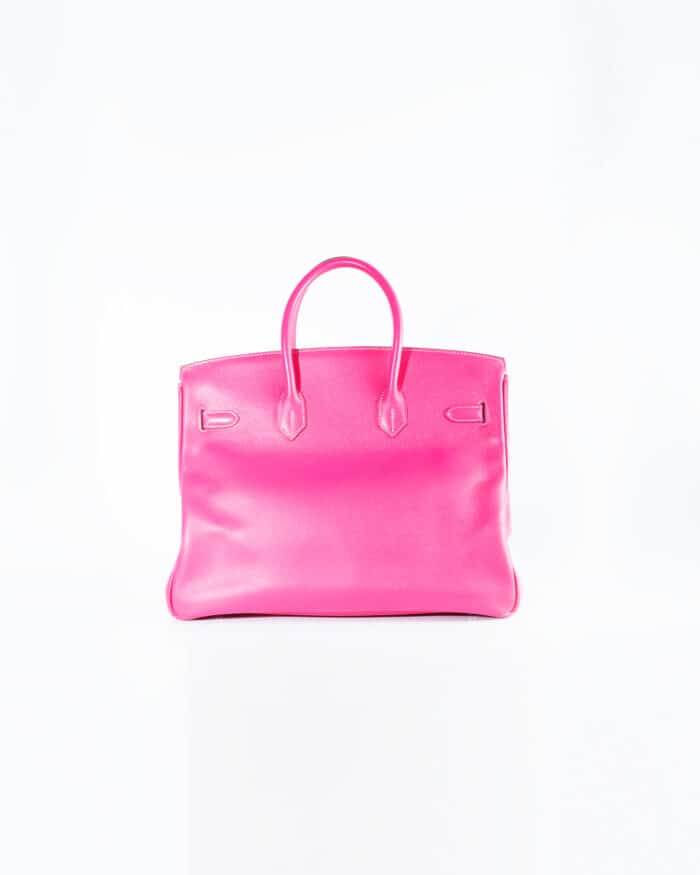 Theย Hermรจs Birkin 35 in Rose Tyrien Epsomย withย palladium hardwareย is a rare and highly coveted collector’s piece, celebrated for its vibrant and feminine hue that transforms the iconic silhouette into a true statement of luxury. This exquisite 35cm bag, produced in limited quantities and often associated with special releases like the 2011 “Candy Collection”ย , is meticulously handcrafted fromย Epsom calfskin leatherย in the stunning shade ofย Rose Tyrienโa bright, deeply saturated pink that exudes warmth and modern sophisticationย . The grained Epsom leather is renowned among connoisseurs for its lightweight feel, exceptional structure, and remarkable resistance to scratches, ensuring the bag’s pristine shape and beauty endure for a lifetimeย . The design is perfectly accentuated byย palladium-plated hardware, including the signature turn-lock, protective feet at the base, and the iconic padlock and keys, all of which provide a cool, gleaming contrast to the warm pink leatherย . True to the Birkin’s heritage, it features the signatureย rolled leather top handles, a top flap with a strap closure, and a tonal leather interior, thoughtfully equipped with both a zippered pocket and a patch pocket for organizationย . Each bag is completed with its accompanyingย clochette (leather bell), lock, and two keysย , all bearing the hallmark of Hermรจs’ peerless craftsmanship. A true investment piece, the Hermรจs Birkin 35 in Rose Tyrien Epsom represents a perfect synthesis ofย artistic color, durable elegance, and enduring value, making it an indispensable addition for the discerning collector who seeks both modern vibrance and the timeless prestige of the Hermรจs maison.