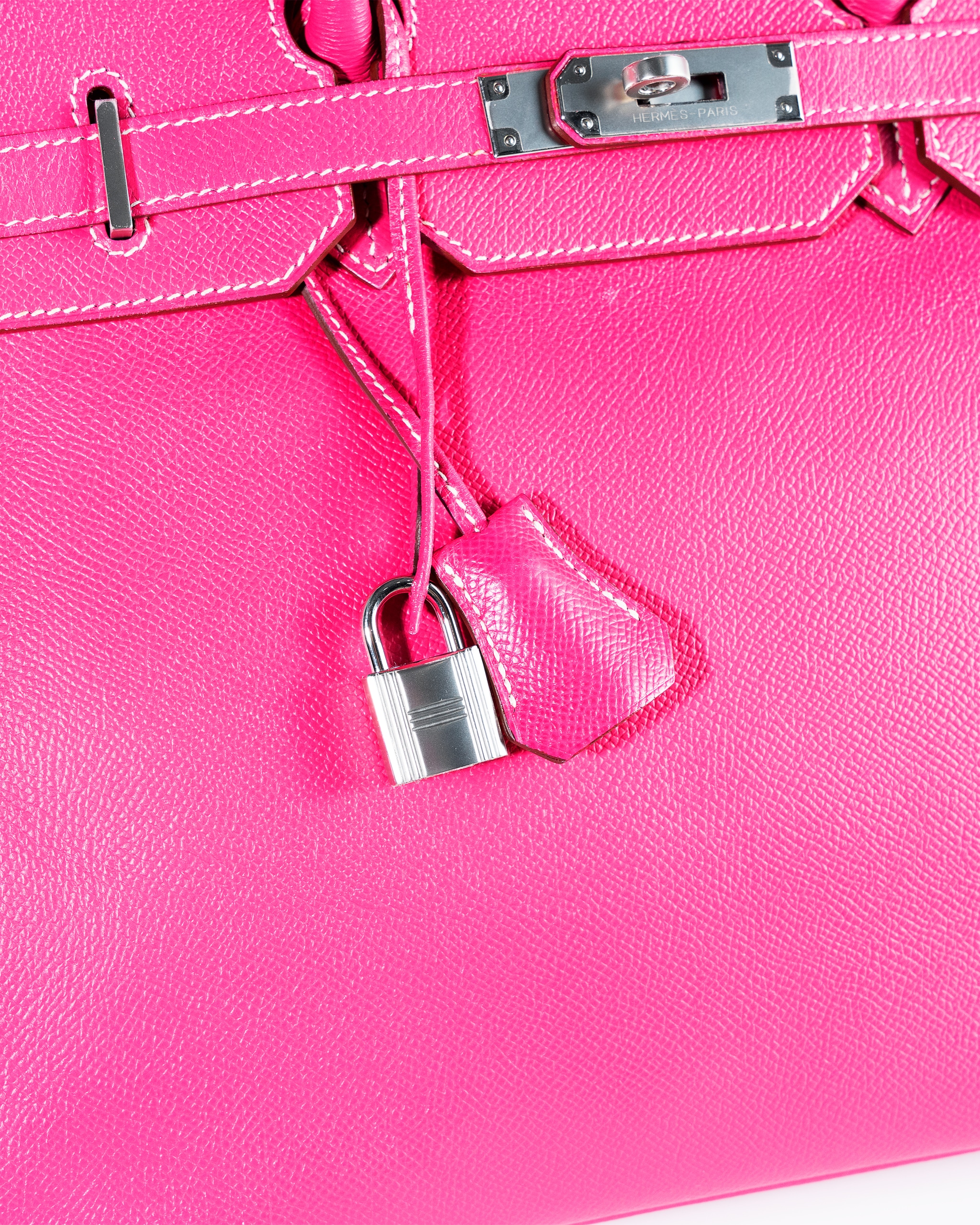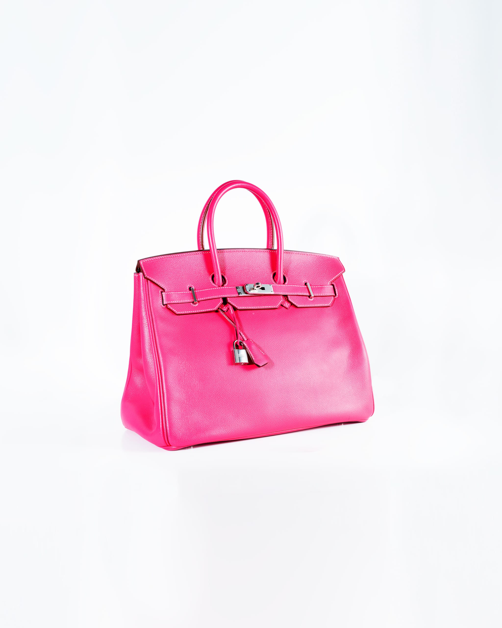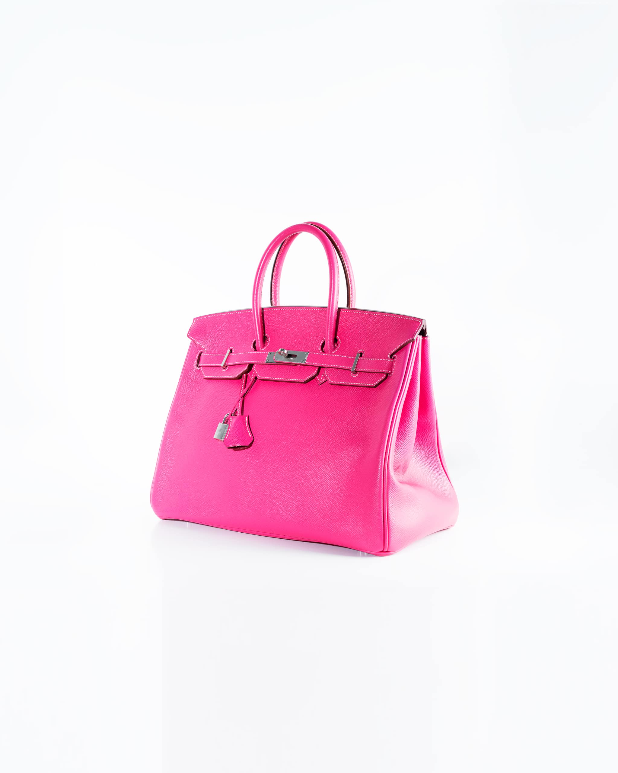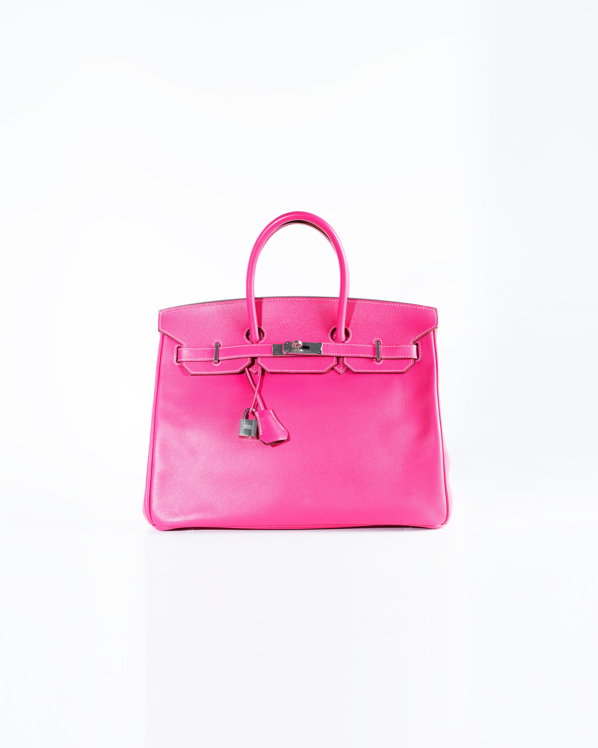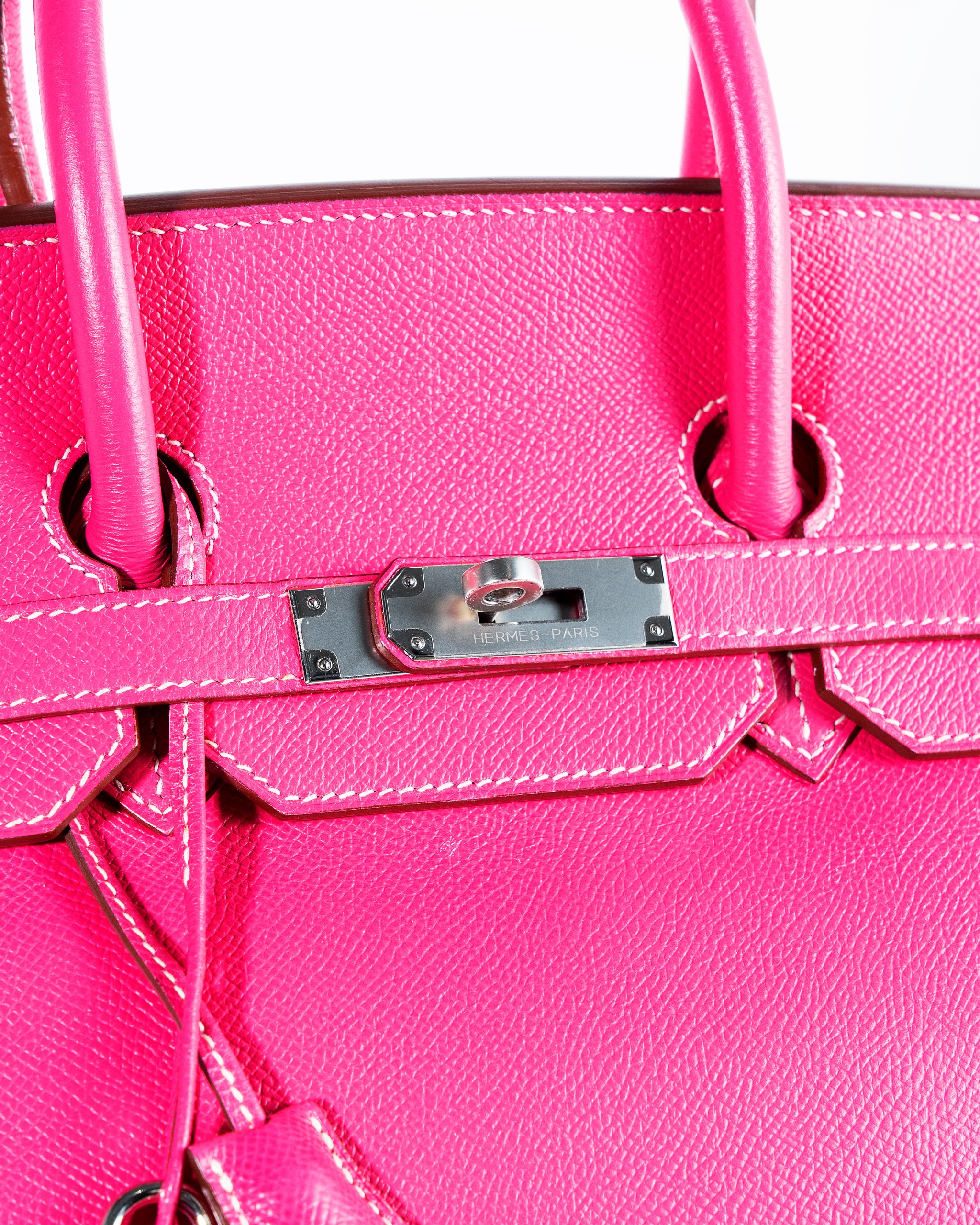 The Hermès Birkin 35 in Rose Tyrien Epsom with palladium hardware is a rare and highly coveted collector’s piece, celebrated for its vibrant and feminine hue that transforms the iconic silhouette into a true statement of luxury. This exquisite 35cm bag, produced in limited quantities and often associated with special releases like the 2011 “Candy Collection” , is meticulously handcrafted from Epsom calfskin leather in the stunning shade of Rose Tyrien—a bright, deeply saturated pink that exudes warmth and modern sophistication . The grained Epsom leather is renowned among connoisseurs for its lightweight feel, exceptional structure, and remarkable resistance to scratches, ensuring the bag’s pristine shape and beauty endure for a lifetime . The design is perfectly accentuated by palladium-plated hardware, including the signature turn-lock, protective feet at the base, and the iconic padlock and keys, all of which provide a cool, gleaming contrast to the warm pink leather . True to the Birkin’s heritage, it features the signature rolled leather top handles, a top flap with a strap closure, and a tonal leather interior, thoughtfully equipped with both a zippered pocket and a patch pocket for organization . Each bag is completed with its accompanying clochette (leather bell), lock, and two keys , all bearing the hallmark of Hermès’ peerless craftsmanship. A true investment piece, the Hermès Birkin 35 in Rose Tyrien Epsom represents a perfect synthesis of artistic color, durable elegance, and enduring value, making it an indispensable addition for the discerning collector who seeks both modern vibrance and the timeless prestige of the Hermès maison.