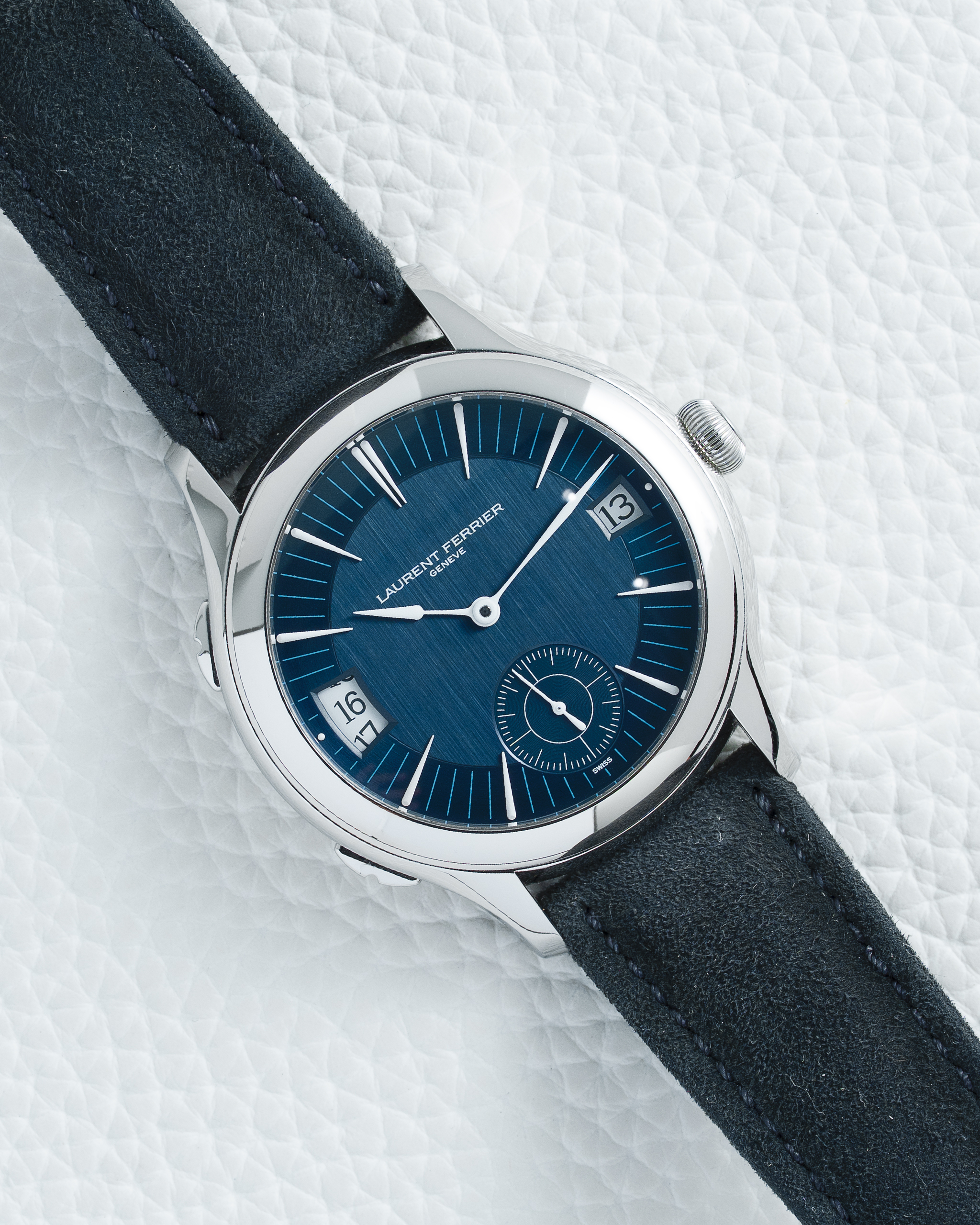 Theย Laurent Ferrier Classic Traveller Blue Ref. LCF007.AC.CW1ย is a masterpiece of understated elegance and horological innovation, offering the discerning traveler an exceptionally intuitive and beautifully crafted dual-time companion housed within a perfectly proportionedย 41mm stainless steel caseย measuring 12.64mm in thicknessย . This refined timepiece features a captivatingย blue dialย with a sophisticated vertical satin-brushed center and a circular satin-brushed outer ring, providing a serene and elegant backdrop for the signatureย applied drop-shaped 18K white gold hour markersย and the brand’s iconicย assegai-shaped hours and minutes hands, also crafted in white gold and white-painted for perfect legibilityย . Designed for global travelers, the dual-time functionality is elegantly simple and intuitive: the central hour hand indicates local time, adjustable forward or backward in one-hour increments via two integrated correctors discreetly positioned on the left side of the case at 8 and 10 o’clock, without ever stopping the watch or affecting the minutesย . Meanwhile, theย home time is clearly displayed in a 24-hour format aperture at 9 o’clock, and the date window at 3 o’clock automatically corrects with time zone changes, ensuring you never lose track of the day when crossing bordersย . A small seconds sub-dial at 6 o’clock completes the balanced and legible dial architectureย . At the heart of this exceptional timepiece, visible through the sapphire crystal caseback, beats the remarkableย in-house automatic Caliber LF230.02ย . This movement, comprising 288 components, is distinguished by its off-centeredย 18K solid gold micro-rotorย with a pawl-fitted unidirectional winding system equipped with a “silent block” shock absorber, and features Laurent Ferrier’s signatureย natural escapement with double direct impulseโa rare and technically sophisticated design originally conceived by Abraham-Louis Breguet that delivers exceptional efficiency and reliabilityย . The calibre oscillates at a frequency of 21,600 vibrations per hour and offers a substantialย 72-hour power reserve, with its bridges and components meticulously hand-finished to the most exacting standards of traditional Genevan watchmakingย . The watch is secured by a luxuriousย blue alligator leather strapย with a supple Alcantara lining, fitted with a stainless steel pin buckle that ensures both comfort and securityย . With itsย 30-meter water resistanceย and sapphire crystals on both the front and display back, this Classic Traveller Blue represents the pinnacle of independent Swiss watchmaking, offering collectors a rare combination of refined aesthetics, ingenious functionality, and the restrained elegance that has made Laurent Ferrier one of the most respected names in contemporary haute horlogerie.ย Key specifications:ย 41mm stainless steel case; blue vertical satin-brushed dial with drop-shaped 18K white gold indices; Caliber LF230.02 automatic movement with micro-rotor and natural escapement; 72-hour power reserve; dual-time function with home time at 9 o’clock and date at 3 o’clock; blue alligator strap with stainless steel buckle; 30m water resistance; sapphire crystal front and backย .