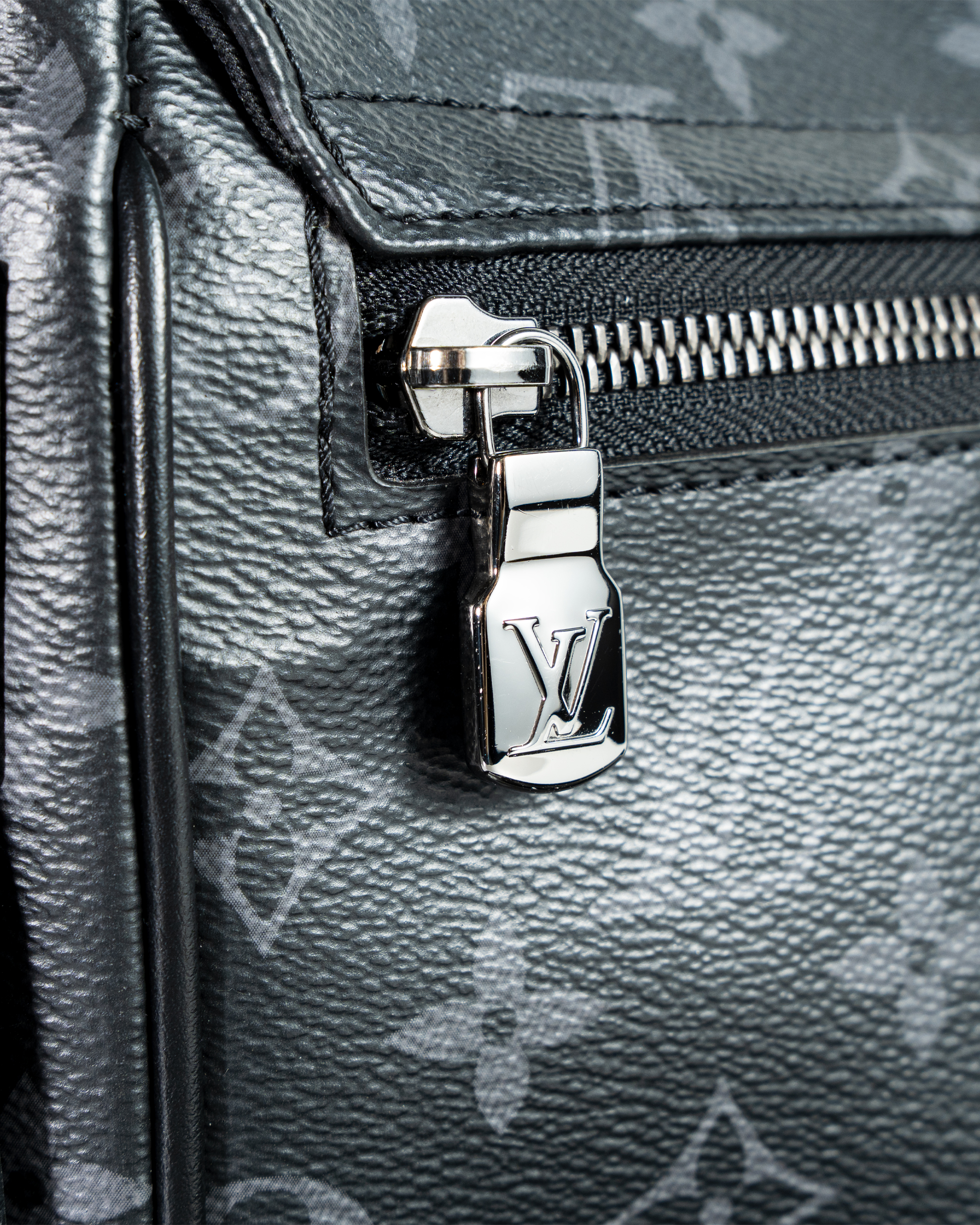 The Louis Vuitton District PM in Eclipse Canvas is a masterful synthesis of modern urban aesthetics and the brand’s iconic heritage, offering a sleek and versatile messenger bag designed for the contemporary individual. This statement piece is crafted from Eclipse canvas, a technical material featuring a dynamic all-over “LV” monogram in shifting tones of deep charcoal black and graphite gray, creating a sophisticated and subtle pattern that embodies a masculine, understated luxury. The bag is accented with black cowhide leather trim on the flap, base, and adjustable shoulder strap, providing both durability and a rich textural contrast, while the palladium-finish hardware adds a cool, modern touch to the overall design. The District PM features a practical front flap closure secured with a magnetic snap for easy access, revealing a spacious interior fully lined in textile microfiber and organized with a zippered pocket, flat pocket, and key bell to keep essentials secure and in order. The adjustable and detachable shoulder strap offers versatile carrying options, allowing the bag to be worn crossbody or on the shoulder for all-day comfort, and the structured silhouette maintains its shape while accommodating daily necessities like a tablet, documents, and personal items. Every detail reflects Louis Vuitton’s legendary commitment to craftsmanship, from the precisely aligned monogram to the reinforced stitching and protective metal feet on the base. As part of the Eclipse collection, this bag represents a bold, contemporary evolution of the Louis Vuitton identity, perfect for the urban professional who demands both functional design and signature style. It is a powerful accessory that transitions effortlessly from business environments to casual settings, making it a timeless investment in a wardrobe that values discretion, quality, and the unmistakable prestige of the Louis Vuitton name.