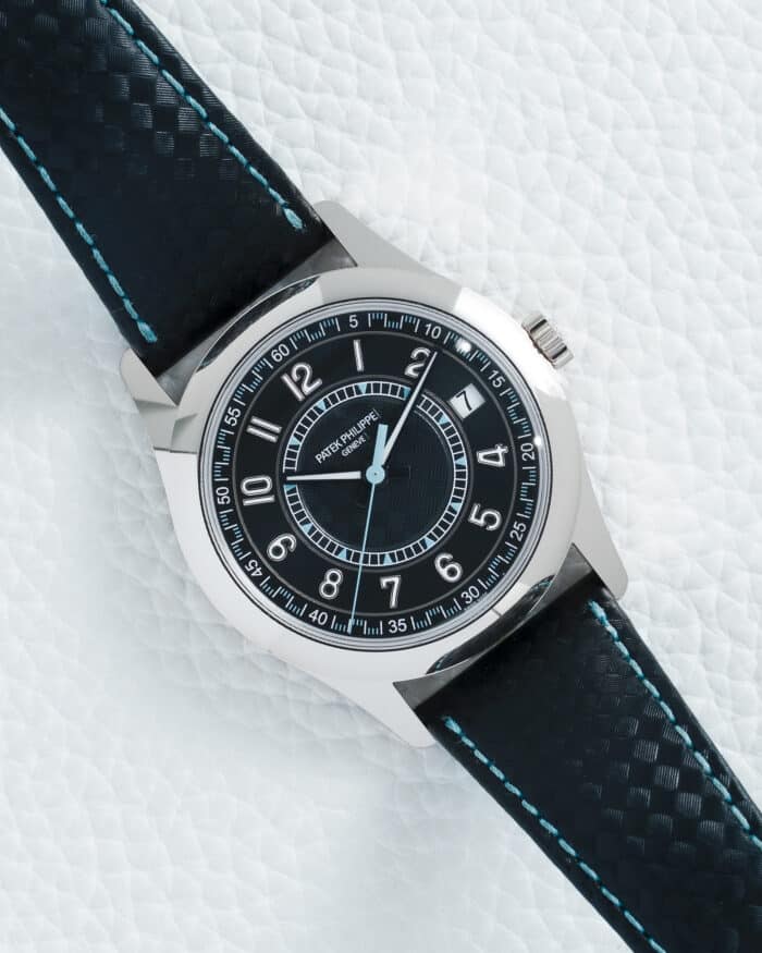Theย Patek Philippe Calatrava Ref. 6007G-011ย is a striking and contemporary reinterpretation of the collection’s classic dress watch codes, presented in aย fully polished 40mm 18K white gold caseย with a slim 9.17mm profile that exemplifies the purity and elegance of the Calatrava lineage established in 1932 while introducing a bold, youthful spirit with its architectural dial design and vibrant sky blue accentsย . This exceptional timepiece commands attention with itsย ebony black dialย featuring three distinct levels of finishing: a snailed inner minute scale, a circular satin-finished hour circle, and a sunburst outer minute scale, all framing a centralย embossed “carbon” motifย that adds contemporary texture and depthย . Appliedย 18K white gold Arabic numeralsย and matching baton-style hands, both generously filled with white luminescent coating, ensure perfect legibility while the showstoppingย sky blue varnished sweep seconds handย and matching transfer-printed triangular hour markers provide a captivating pop of color that infuses the dial with modernity and verveย . At its heart beats the celebratedย in-house automatic caliber 26-330 S C, a movement comprising 212 meticulously finished parts with a 21K gold central rotor, visible through the sapphire crystal caseback, delivering a power reserve ofย 35 to 45 hoursย and offering practical complications including aย date aperture at 3 o’clockย and a stop-seconds function for precise time settingย . The watch is secured by a luxuriousย black calfskin leather strapย embossed with a matching “carbon” pattern, beautifully accented withย sky blue stitching and liningย that echoes the dial’s distinctive palette, and fastened with an elegantย 18K white gold prong buckleย . Withย 30 meters of water resistanceย and sapphire crystals protecting both the dial and the exhibition caseback, this Calatrava represents the perfect synthesis of Patek Philippe’s traditional horological mastery and a daring contemporary aesthetic, offering discerning collectors a timepiece that is at once timeless and refreshingly modern.ย Key specifications:ย 40mm 18K white gold case; ebony black dial with embossed carbon center and sky blue seconds hand; Caliber 26-330 S C automatic movement with date; 35-45 hour power reserve; black calfskin strap with sky blue stitching and white gold buckle; 30m water resistance; sapphire crystal front and backย .