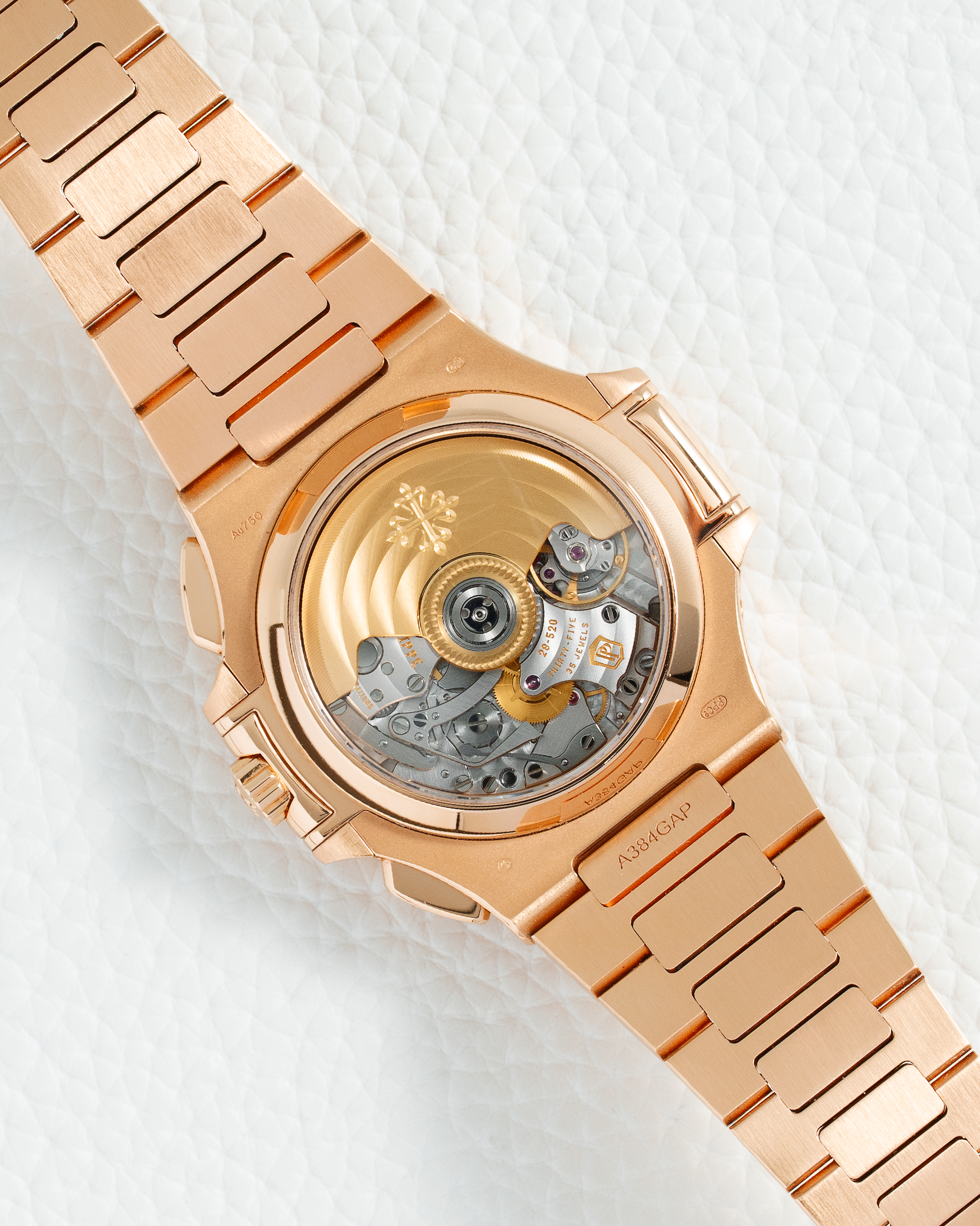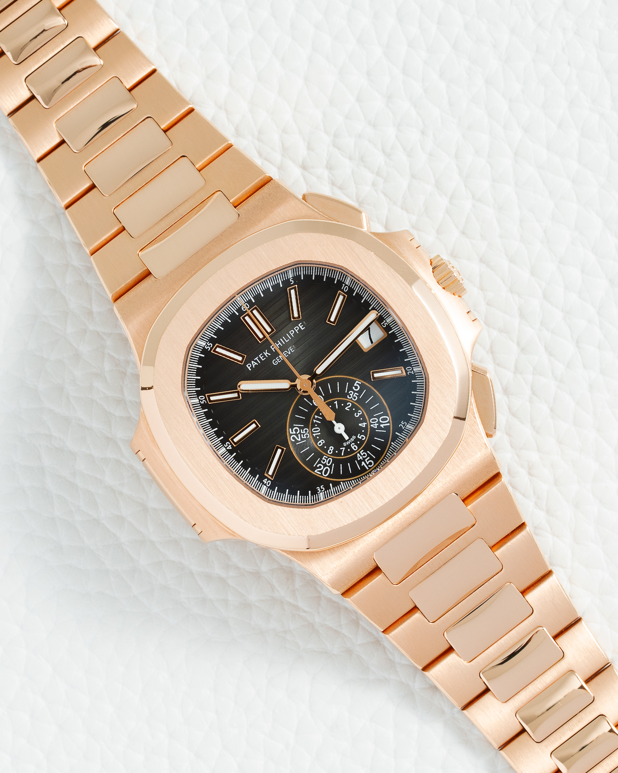 The Patek Philippe Nautilus 5980/1R-001 in solid rose gold with its iconic black dial represents the absolute pinnacle of luxury sports watch design, blending Gerald Genta’s legendary 1976 design with Patek Philippe’s uncompromising watchmaking excellence in a timepiece that commands both respect and admiration. This 40.5mm masterpiece features a solid 18k rose gold case with the Nautilus’ signature rounded octagonal bezel and integrated bracelet that creates a seamless flow from case to wrist, while the striking black-blue gradient dial undergoes a complex manufacturing process to achieve its distinctive horizontal embossed pattern that mimics a ship’s porthole and creates a mesmerizing play of light from deep black to navy blue depending on the angle. The applied rose gold hour markers and luminous hands ensure exceptional legibility, while the chronograph function with 60-minute and 12-hour totalizers combined into a single sweeping seconds hand and elegant date window at 4:30 maintains the dial’s perfect balance. Powered by the self-winding Caliber CH 28-520 C, this movement offers a 55-hour power reserve and features Patek Philippe’s prestigious Patek Seal certification for outstanding accuracy and finishing quality, visible through the sapphire crystal caseback that reveals the exquisitely decorated movement with its Geneva stripes, gold rotor, and beveled bridges. The integrated rose gold bracelet with its articulated links provides exceptional comfort and a seamless aesthetic, secured by a rose gold fold-over clasp that bears the Calatrava cross. Every detail reflects Patek Philippe’s uncompromising standards, from the perfectly executed dial embossing to the alternating brushed and polished surfaces and scratch-resistant sapphire crystal with anti-reflective coating. The 5980/1R-001 offers 120-meter water resistance while maintaining elegant proportions that transition seamlessly from aquatic activities to formal occasions. With its harmonious blend of precious materials, technical innovation, and iconic design, this Nautilus stands as a testament to Patek Philippe’s ability to create watches that are both mechanically exceptional and visually magnificent – a true modern classic that represents one of the most coveted references in contemporary watch collecting, appealing to connoisseurs who appreciate sophisticated sports watches with undeniable presence and the highest level of Swiss watchmaking artistry.