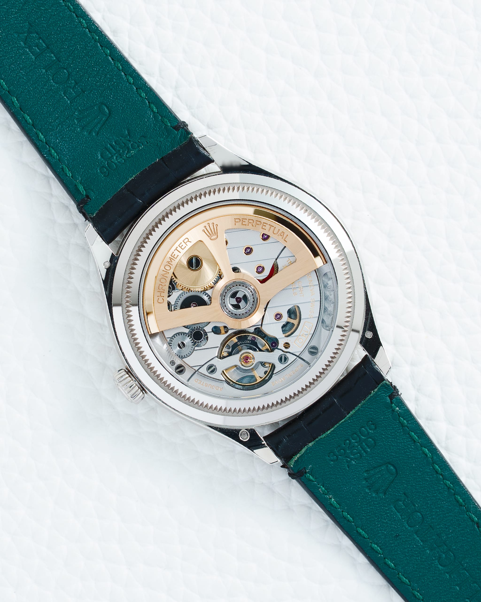 At the heart of the 1908 beats the all-new, in-houseย Caliber 7140ย . Visible through the watch’sย exhibition casebackโa rare and celebrated feature for Rolexโthis self-winding movement is a showcase of technical artistryย . It features Rolexโsย Syloxi silicon hairspringย and the efficientย Chronergy escapement, delivering a robustย 66-hour power reserveย and precision certified as aย Superlative Chronometerย (COSC + Rolex certification after casing)ย . The exquisite finishing is evident in theย Rolex Cรดtes de Genรจveย decoration and theย 18k gold rotorย visible through the casebackย . The watch is presented on a sophisticatedย black alligator leather strapย with a green calfskin lining, secured by the brandโs newly developedย Dualclaspโan 18k white gold double-folding clasp engineered to always sit perfectly centered on the wristย . Water-resistant to 50 meters, the Perpetual 1908 Ref. 52509 is not merely a timepiece; it is a statement of sophisticated taste and a testament to Rolex’s enduring legacy of innovation and classicism, marking an exciting new era for the brand’s dress watch offeringsย .