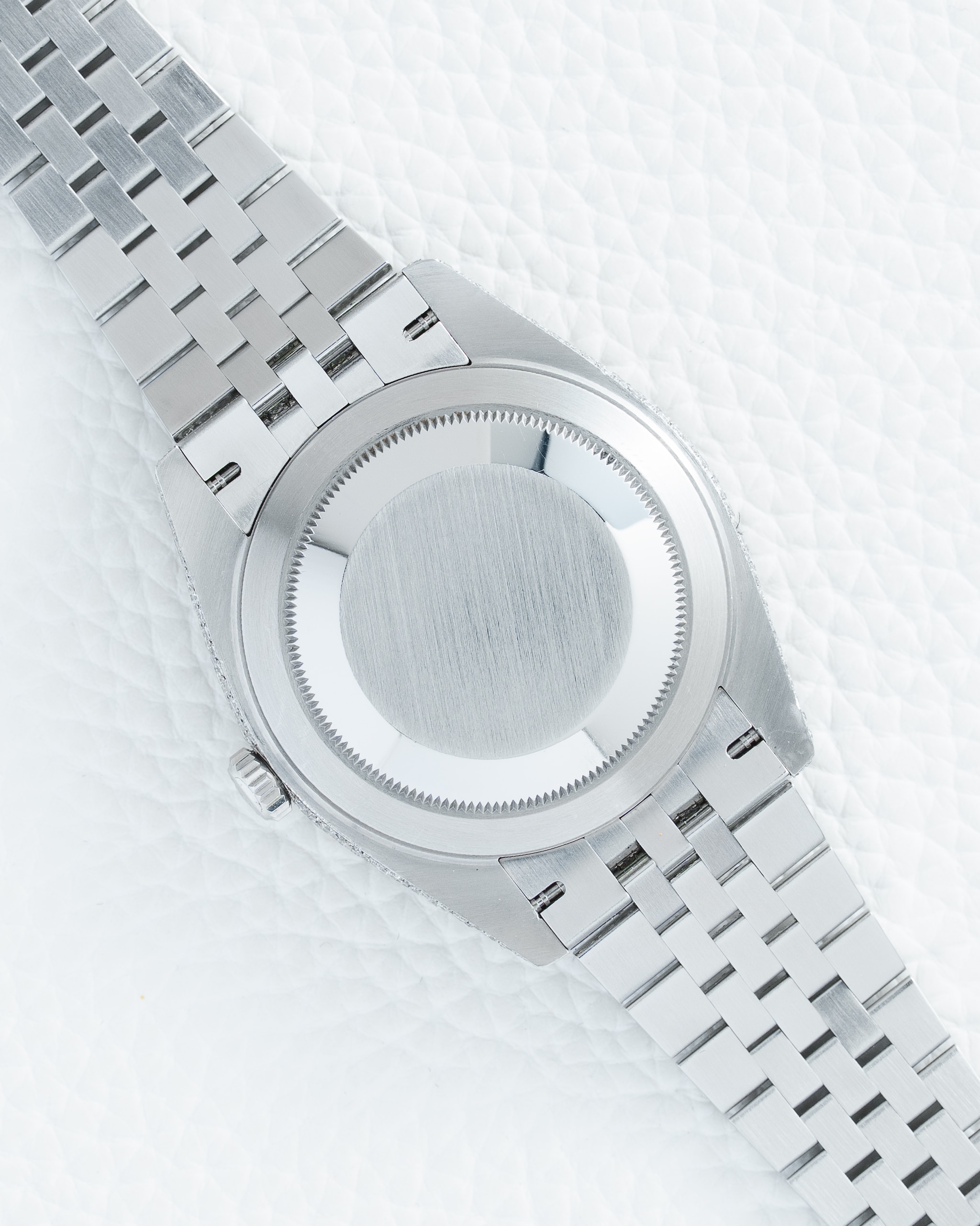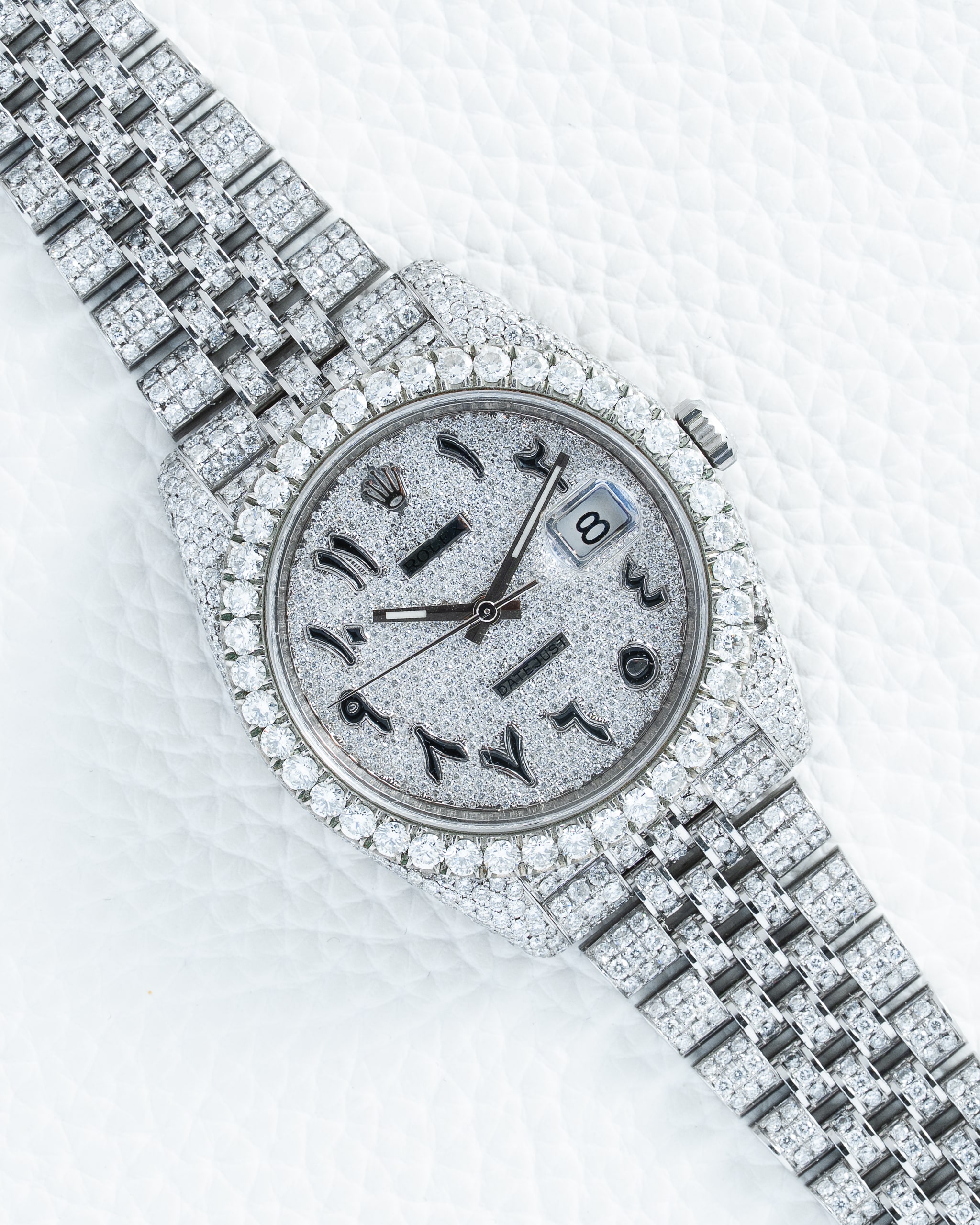The opulent theme continues onto the dial, where the traditional baton hour markers have been replaced with a custom arrangement of sparkling round brilliant-cut diamonds, ensuring perfect legibility against the often-chosen deep black or slate grey backdrop. The Royal Clasp on the Jubilee bracelet is also elegantly set with a row of diamonds, adding a final touch of refinement to this bespoke creation. Despite its dazzling exterior, the watch retains all of its original functionality, including the signature date window at 3 o’clock magnified by the Cyclops lens and its robust . This custom creation represents a unique intersection of Rolex’s legendary horological engineering and the bold, expressive art of high-end jewelry customization, resulting in a one-of-a-kind statement piece that is as mechanically sound as it is visually arrestingโperfect for the collector who desires a timepiece that is truly without equal