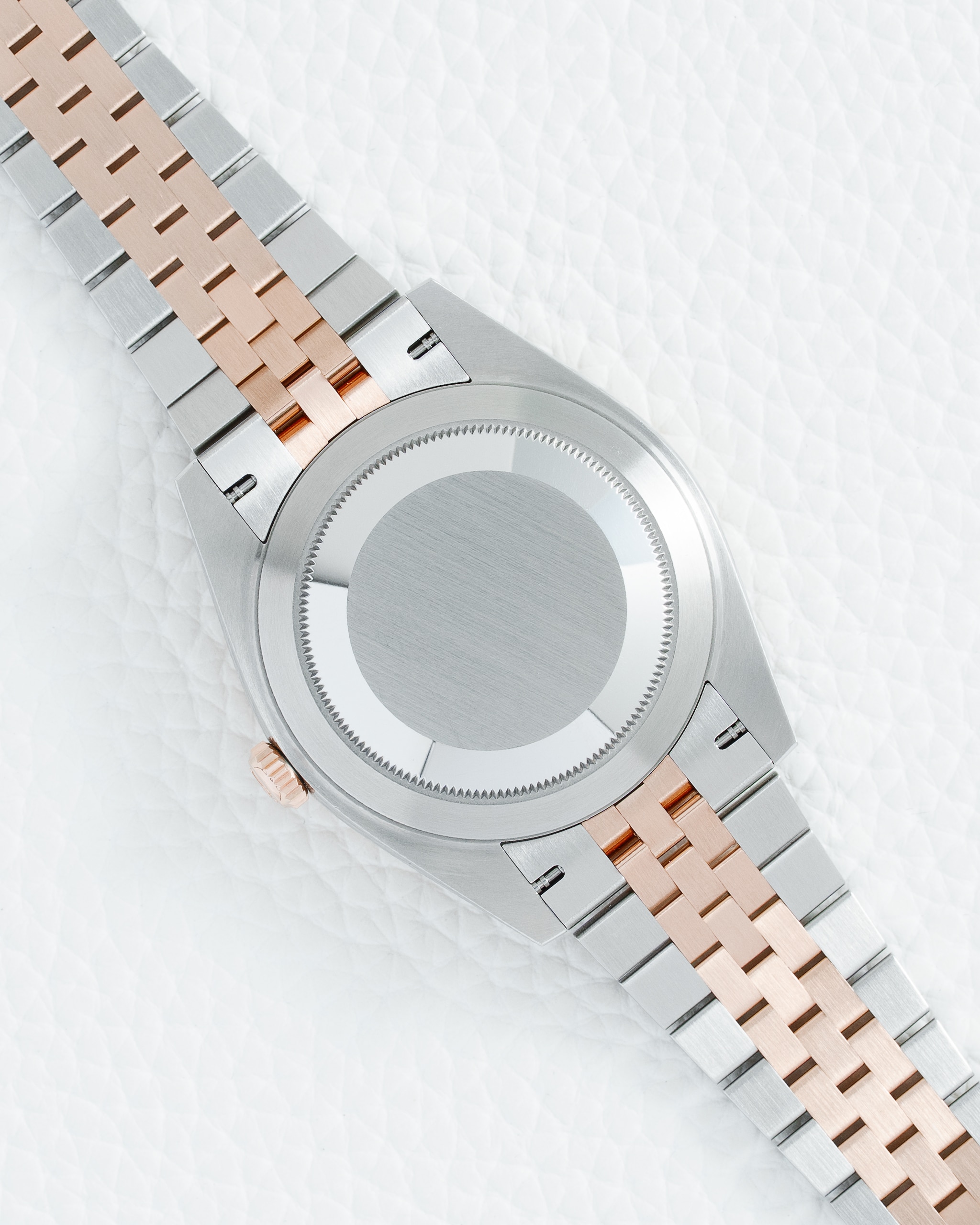 The Rolex Datejust 41 126331 with its striking Rhodium motif dial and two-tone Everose gold and steel construction represents a modern masterpiece of texture and light, blending contemporary design with classic Rolex craftsmanship in a timepiece that offers both visual intrigue and technical excellence. This 41mm model features a stainless steel case complemented by an 18k Everose gold fluted bezel that creates a captivating play of light, perfectly framing the unique Rhodium motif dial which showcases an intricate, three-dimensional pattern that resembles finely woven fabric or delicate guilloché, creating a mesmerizing depth that changes character depending on the angle of light. The applied Chromalight hour markers and hands ensure exceptional legibility against the textured background, while the date window at 3 o’clock features the signature Cyclops magnification lens for enhanced readability. Powered by Rolex’s Caliber 3235, a next-generation movement with Chronergy escapement and 70-hour power reserve, this watch is certified as a Superlative Chronometer for outstanding precision. The five-piece link Jubilee bracelet masterfully combines stainless steel links with 18k Everose gold center links, secured by a concealed Crownclasp that offers both security and seamless aesthetics. Every detail reflects Rolex’s meticulous craftsmanship, from the scratch-resistant sapphire crystal to the hermetically sealed Oyster case that provides 100-meter water resistance. The 126331 represents the perfect harmony of contemporary artistry and timeless luxury, offering a watch that transitions effortlessly from business attire to formal occasions. With its harmonious blend of precious materials, textured aesthetics, and cutting-edge technology, this Datejust stands as a testament to Rolex’s ability to innovate within a classic framework – a perfect choice for those who appreciate the warmth of Everose gold combined with the cool sophistication of a textured silver dial, creating a timepiece that is both a statement of modern style and a reliable instrument of precision, making it an ideal acquisition for the collector who values both distinctive design and the unwavering quality of the Rolex name.