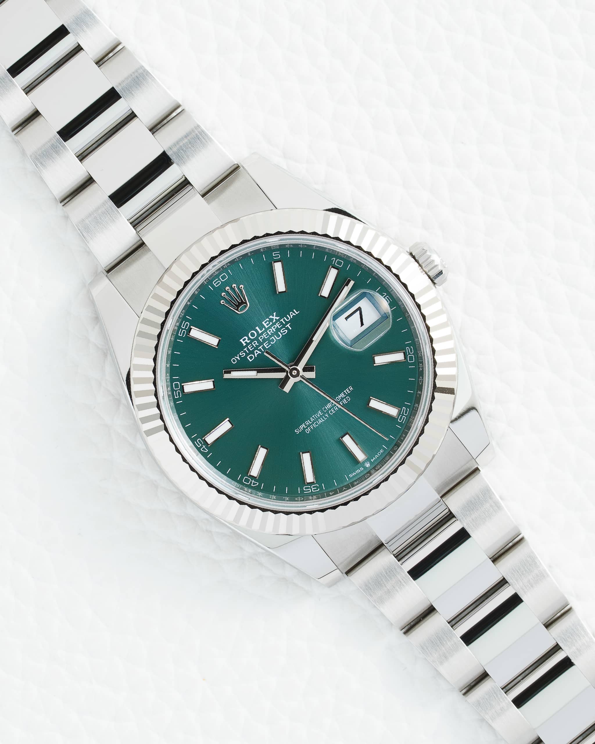 Theย Rolex Datejust 41 Ref. 126334ย with itsย captivating green dial,ย iconic fluted bezel, andย versatile Oyster braceletย is a masterful expression of contemporary elegance, masterfully blending the timeless design codes of the world’s most recognized dress watch with Rolex’s latest-generation technology . This 41mm timepiece, crafted fromย solid Oystersteelย and complemented by anย 18k white gold fluted bezel, achieves a perfect balance of sporty robustness and refined luxury . Theย green sunburst dialย is a study in vibrant, sophisticated style, its rich hue shifting beautifully from deep forest to brilliant emerald depending on the light, and is adorned withย luminous Chromalight hour markers and handsย for exceptional legibility in any environment . A discreetย date window at 3 o’clock, magnified by the signature Cyclops lens, maintains the dial’s clean and balanced aesthetic .