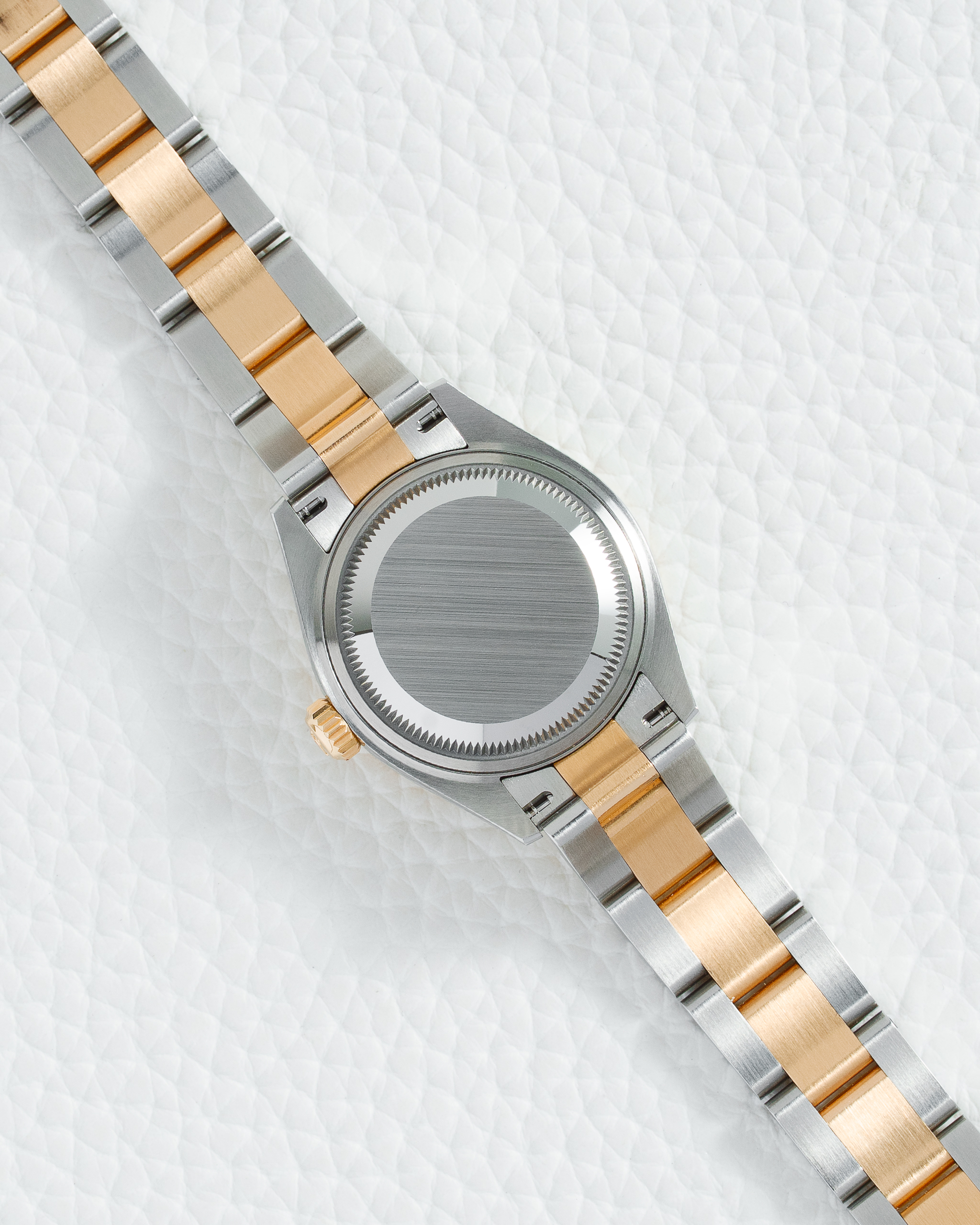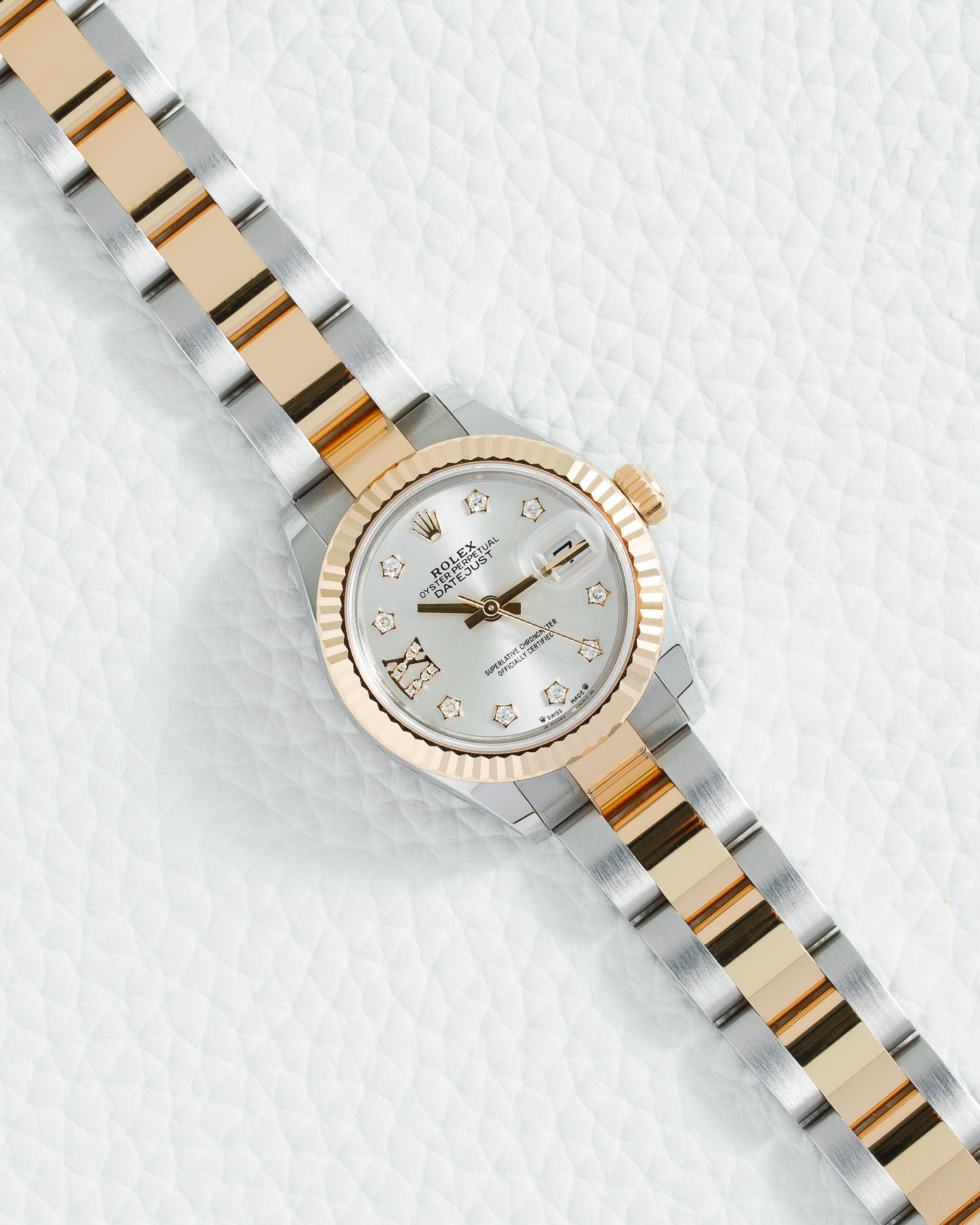 The Rolex Lady-Datejust 28mm 279173 with its captivating silver star diamonds dial and two-tone yellow gold and steel construction represents a harmonious fusion of celestial-inspired whimsy and classic Rolex luxury, creating a timepiece that balances playful artistry with serious watchmaking excellence. This exquisite model features a stainless steel case complemented by an 18k yellow gold fluted bezel that creates a dazzling play of light, perfectly framing the silver sunburst dial adorned with a constellation of brilliant-cut diamond stars as hour markers that sparkle against the luminous background like a night sky. The applied yellow gold hands filled with Chromalight ensure optimal visibility in any lighting condition, while the date window at 3 o’clock features the signature Cyclops magnification lens for enhanced readability. Powered by Rolex’s Caliber 2236, a self-winding movement with Syloxi hairspring and 55-hour power reserve, this watch is certified as a Superlative Chronometer for outstanding precision and reliability. The three-piece link Oyster bracelet masterfully combines stainless steel links with 18k yellow gold center links, secured by a folding Oysterlock clasp with Easylink extension system for perfect comfort and security. Every detail reflects Rolex’s obsessive attention to craftsmanship, from the scratch-resistant sapphire crystal to the flawless diamond setting where each star is carefully positioned for balance and brilliance, and the hermetically sealed Oyster case that provides 100-meter water resistance. The 279173 represents the perfect harmony of fantastical design and technical robustness, offering a watch that transitions seamlessly from daytime charm to evening sophistication. With its enchanting combination of celestial diamond motifs, precious two-tone materials, and classic fluted bezel, this Lady-Datejust stands as a testament to Rolex’s ability to create timepieces that are both mechanically exceptional and artistically delightful – a true collector’s piece for the woman who appreciates a touch of magic and storytelling in her accessories, combined with the unwavering precision and quality of Swiss watchmaking, making it an ideal heirloom that captures imagination and light with every glance, appealing to those who seek both horological integrity and a distinctive, romantic aesthetic.