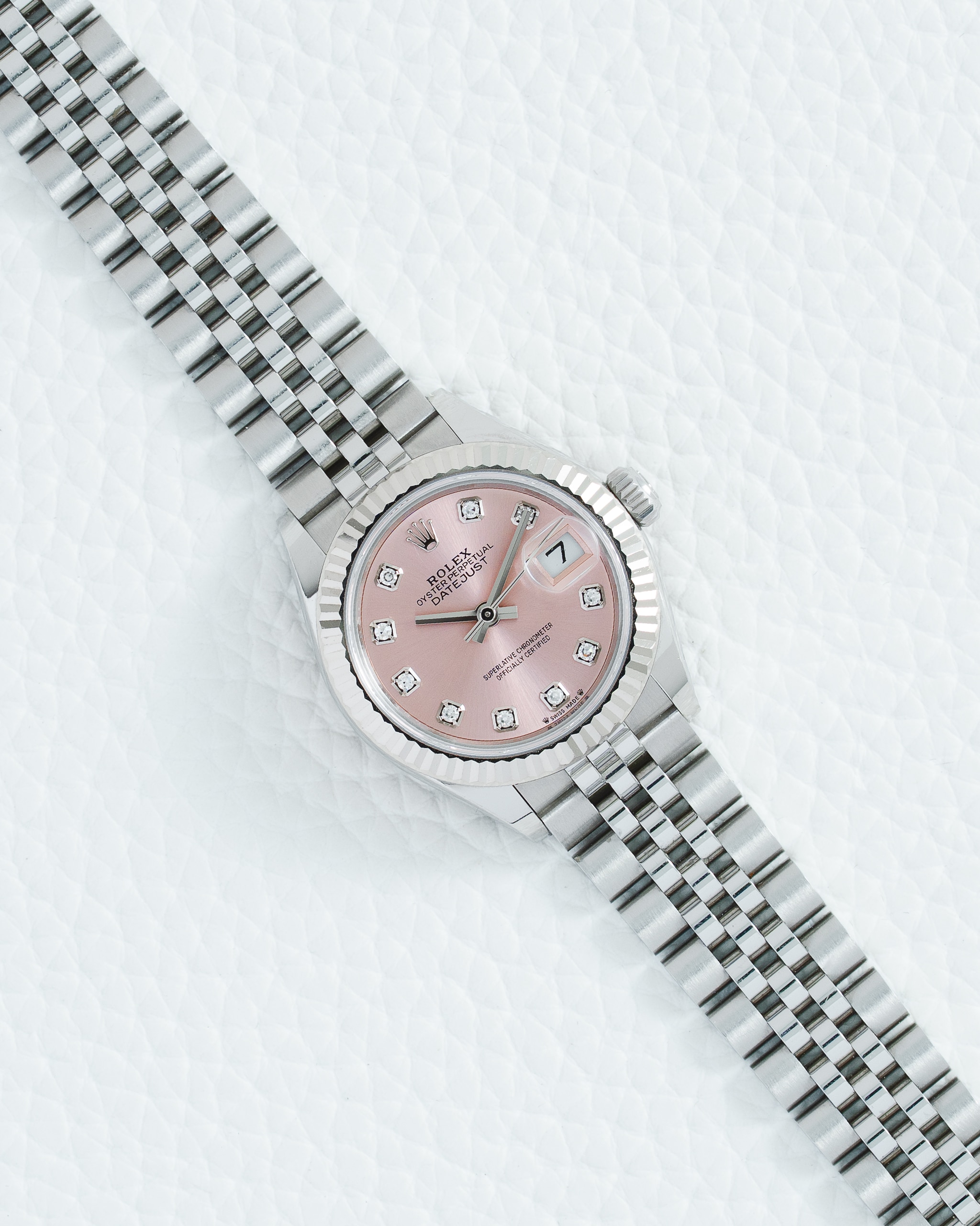 Theย Rolex Lady-Datejust 28mm 279174ย with itsย enchanting pink diamond dialย andย stainless steel constructionย represents the pinnacle of feminine elegance and luxurious refinement, blending a romantic color palette with exquisite gem-setting in a timepiece designed for the discerning woman. This exquisite model features aย solid stainless steel caseย complemented by anย 18k white gold fluted bezelย that creates a dazzling play of light, perfectly framing theย soft pink sunburst dialย meticulously set withย brilliant-cut diamond hour markersย that sparkle with a delicate rose-tinted fire against the luminous background. Theย applied white gold handsย filled with Chromalight ensure optimal legibility in any lighting condition, while theย date window at 3 o’clockย features the signatureย Cyclops magnification lensย with aย diamond-set frameย that maintains the dial’s luxurious continuity. Powered by Rolex’sย Caliber 2236, a self-winding movement withย Syloxi hairspringย andย 55-hour power reserve, this watch is certified as aย Superlative Chronometerย for outstanding precision and reliability. Theย five-piece link Jubilee bracelet, crafted entirely fromย stainless steel, provides exceptional comfort and a seamless aesthetic flow from case to wrist, secured by aย concealed Crownclaspย that offers both security and seamless aesthetics. Every detail reflects Rolex’s obsessive attention to craftsmanship, from theย scratch-resistant sapphire crystalย to theย flawless diamond settingย where each stone is carefully selected for optimal brilliance and alignment, and theย hermetically sealed Oyster caseย that providesย 100-meter water resistance. Theย 279174ย represents the perfect harmony ofย romantic aesthetics and technical excellence, offering a watch that transitions seamlessly from daytime sophistication to evening glamour. With its breathtaking combination ofย delicate pink dial, diamond accents, and classic fluted bezel, this Lady-Datejust stands as a testament to Rolex’s ability to create timepieces that are both mechanically exceptional and artistically magnificent โ a true collector’s piece for the woman who appreciates the finest blend of soft color, luxurious gem-setting, and Swiss watchmaking precision, making it an ideal heirloom that captures light and attention with its radiant beauty and impeccable craftsmanship, appealing to those who seek both horological integrity and a distinctly feminine, romantic aesthetic.