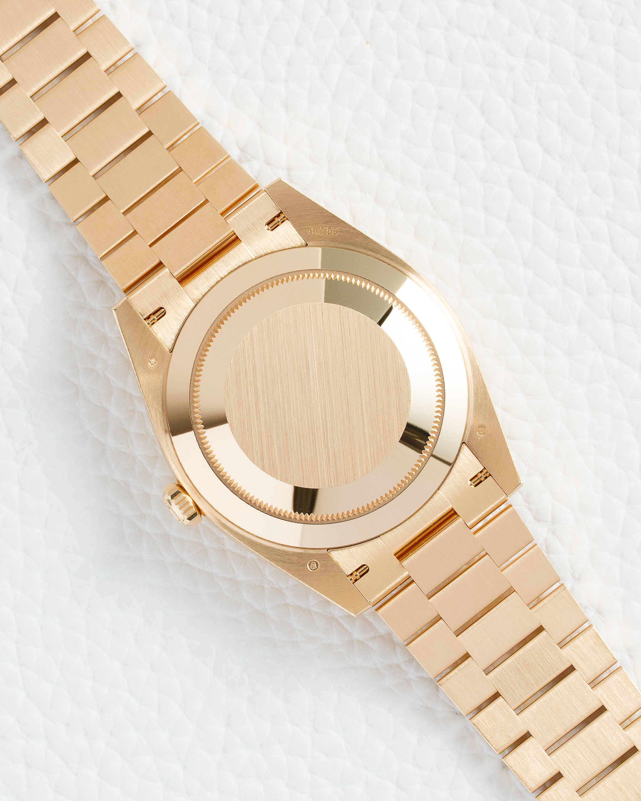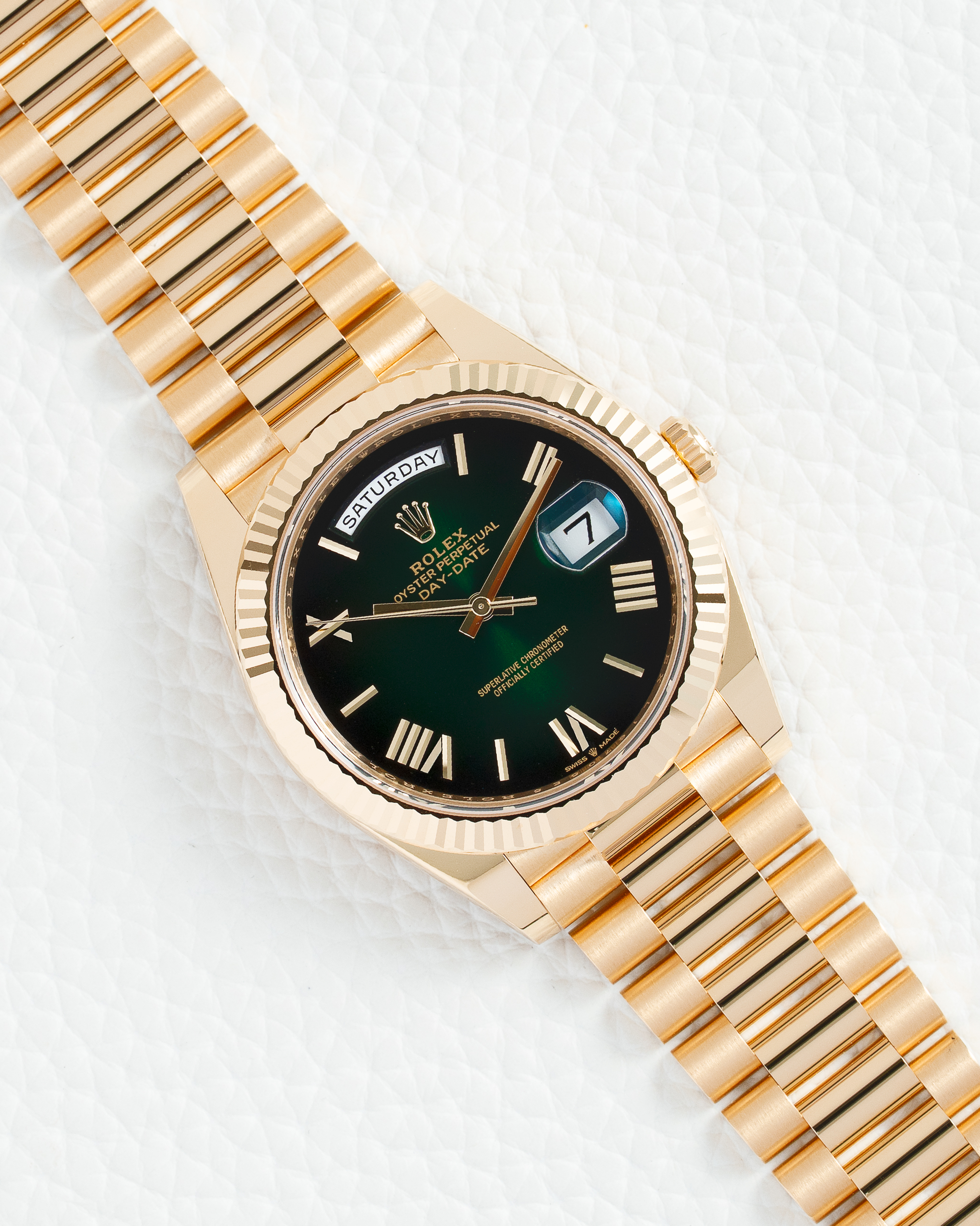 The Rolex Day-Date 40 228238 in solid 18k yellow gold with its stunning green ombré Roman numeral dial represents the absolute pinnacle of luxury watchmaking, embodying prestige, innovation, and timeless elegance in a single iconic timepiece often referred to as the “President’s watch.” This magnificent 40mm masterpiece features a case and bracelet crafted entirely from solid yellow gold that exudes warmth and opulence from every angle, complemented by the signature semi-circular three-piece link President bracelet that offers unparalleled comfort and a seamless flow from case to wrist. The breathtaking green ombré dial undergoes a sophisticated manufacturing process to achieve its gradual color transition from deep forest green at the periphery to vibrant emerald at the center, creating a mesmerizing visual effect that changes character depending on the light. The applied yellow gold Roman numeral hour markers provide a classic, luxurious aesthetic while ensuring optimal legibility, and the Chromalight-filled hands maintain perfect visibility in any lighting conditions. The day display at 12 o’clock appears in an elegant matching green aperture with flawless typography, while the date window at 3 o’clock features the iconic Cyclops magnification lens for enhanced readability. Powered by Rolex’s Caliber 3255, a next-generation movement with Chronergy escapement and 70-hour power reserve, this watch is certified as a Superlative Chronometer for outstanding precision, maintaining accuracy within +2/-2 seconds per day. Every detail reflects Rolex’s relentless pursuit of perfection, from the fluted bezel that catches light with every movement to the scratch-resistant sapphire crystal and hermetically sealed case that provides 100-meter water resistance. The 228238 combines the Day-Date’s legendary status with a contemporary color palette and technical innovations, making it equally suitable for boardroom meetings and formal occasions. With its harmonious blend of precious materials, cutting-edge technology, and iconic design, this Day-Date stands as a symbol of achievement and sophistication for those who demand the very best in luxury watchmaking. The green ombré dial variant offers a distinctive yet refined elegance that complements the warm tones of yellow gold, creating a timepiece that is both instantly recognizable and refreshingly modern – a true testament to Rolex’s ability to evolve an icon while maintaining its essential character and uncompromising standards of excellence.
