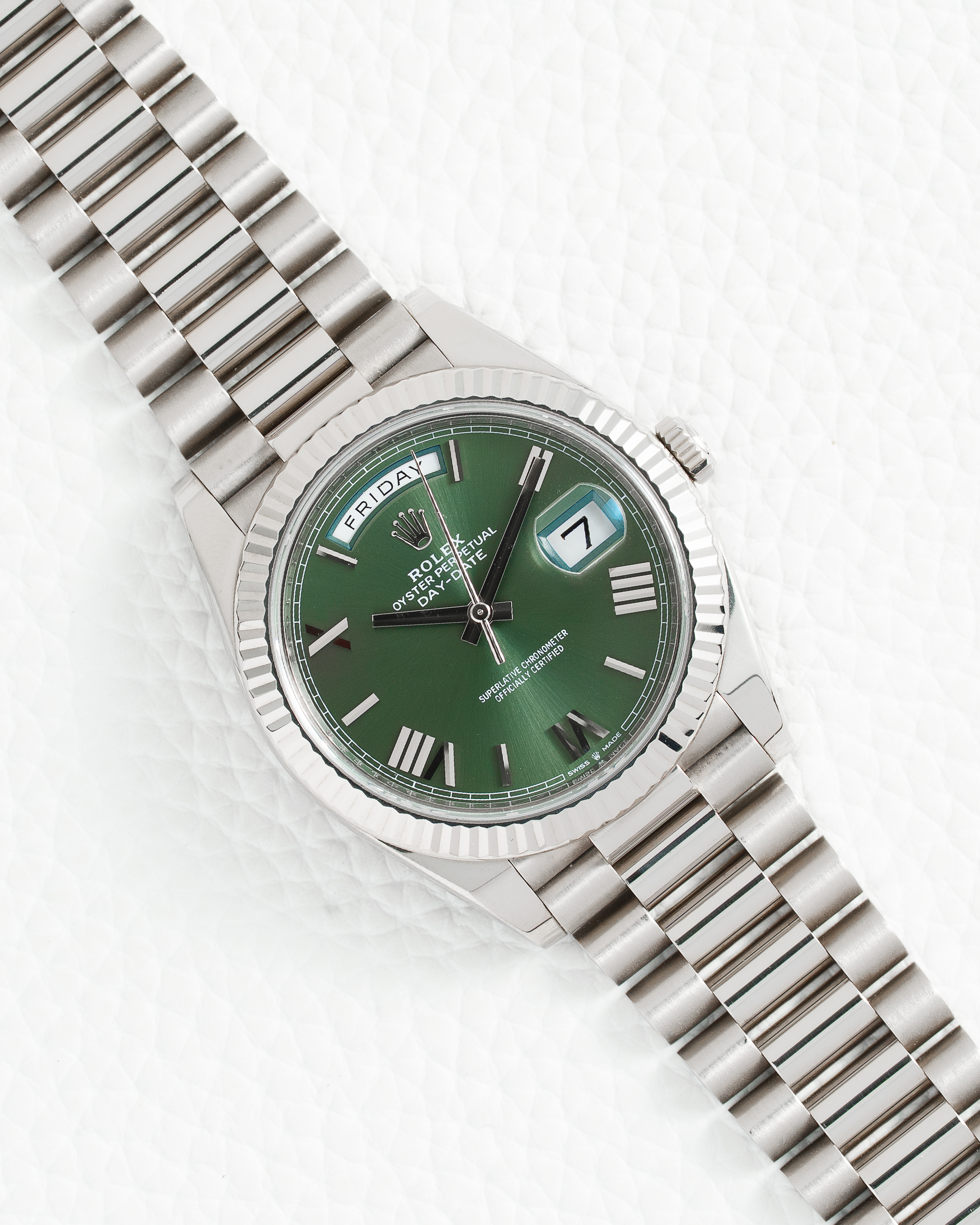 The Rolex Day-Date 40 Ref. 228239 in solid 18K white gold with an exquisite olive green dial represents the pinnacle of luxury watchmaking, combining Rolex’s legendary craftsmanship with contemporary elegance. This prestigious timepiece features a 40mm case and iconic President bracelet, both crafted from the finest white gold, offering a lustrous yet understated presence that exudes sophistication. The stunning olive green dial, with its subtle sunray finish, provides a rich, distinctive backdrop for the luminescent hour markers and hands, while the signature day display at 12 o’clock and date window at 3 o’clock underscore its functional brilliance. Powered by the Caliber 3255, a Superlative Chronometer-certified movement, this watch delivers unparalleled precision, a 70-hour power reserve, and exceptional resistance to shocks and magnetism—ensuring performance worthy of the Rolex name. The fluted bezel, a hallmark of the Day-Date collection, adds a touch of refined texture, while the scratch-resistant sapphire crystal guarantees lasting clarity. Every detail, from the concealed Crownclasp on the President bracelet to the flawless dial execution, reflects Rolex’s relentless pursuit of perfection. As the watch of choice for world leaders, visionaries, and icons, the Day-Date 228239 is more than a timepiece—it’s a statement of achievement and timeless taste. Its harmonious blend of precious materials, masterful engineering, and contemporary design makes it a cornerstone of any luxury retail collection, destined to captivate discerning collectors who demand the absolute best. A true masterpiece, this Day-Date exemplifies Rolex’s legacy of excellence, offering a modern interpretation of the ultimate status watch with its striking olive dial and impeccable white gold craftsmanship.