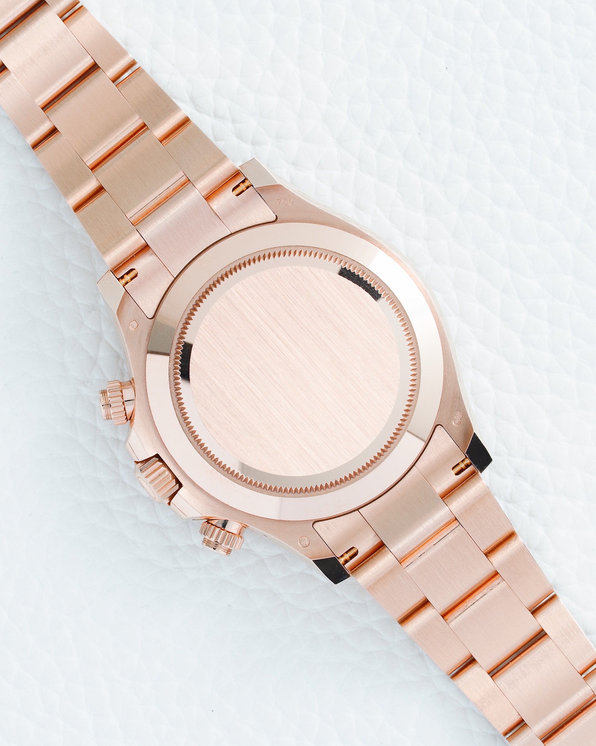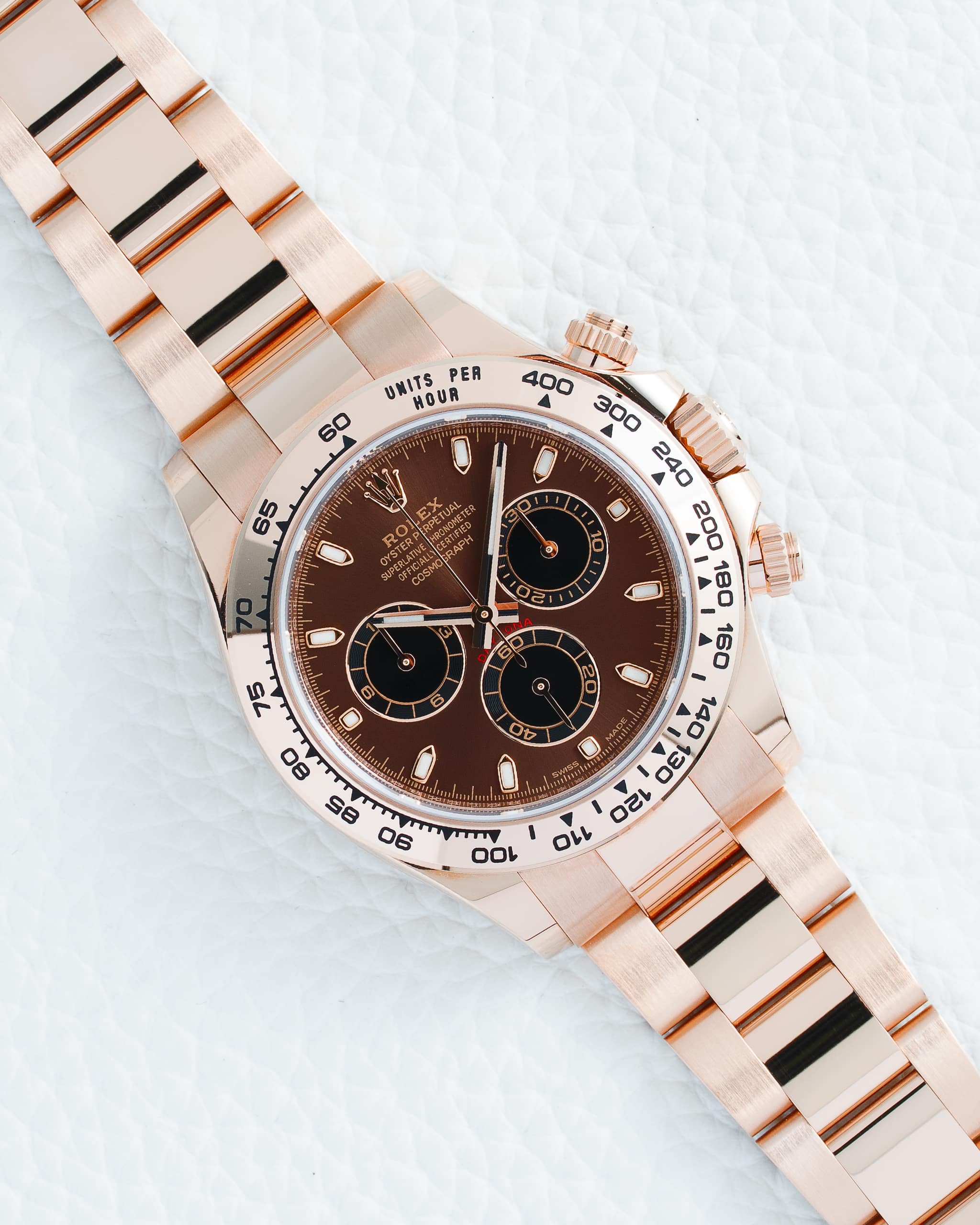 Theย Rolex Cosmograph Daytona Ref. 116505ย inย solid 18K Everose goldย withย chocolate dialย represents the pinnacle of luxury chronograph design, featuring aย 40mm caseย crafted entirely from Rolex’s proprietary Everose gold alloy that maintains its rich, warm hue indefinitely, paired with aย sumptuous chocolate brown sunburst dialย that transitions from deep espresso to radiant cognac depending on lighting, adorned withย contrasting gold sub-dialsย at 3, 6, and 9 o’clock for the chronograph’s 30-minute, 12-hour, and small seconds functions. Powered by Rolex’s legendaryย Caliber 4130, a self-winding chronograph movement withย column-wheel mechanismย andย vertical clutchย for smooth operation, this watch deliversย 72-hour power reserveย andย COSC-certified Superlative Chronometer precision (ยฑ2 seconds/day), protected byย 100-meter water resistanceย and aย scratch-resistant sapphire crystal. Theย Oyster bracelet, also crafted from solid Everose gold, features polished center links and brushed outer links for dynamic contrast, secured by anย Oysterlock claspย with Easylink 5mm comfort extension for perfect fit, while theย ceramic Cerachrom tachymeter bezelย in sleek brown adds modern durability and complements the dial’s warm tones. Designed for both performance and prestige, this Daytona featuresย screw-down pushers,ย luminescent Chromalight hands and markersย for optimal visibility, and aย solid casebackย that ensures the watch’s robust construction. Presented in Rolex’s signature green packaging, this Everose gold masterpiece represents the ultimate fusion of technical innovation and precious metal craftsmanship, offering discerning collectors a chronograph that excels in both precision timing and luxurious aesthetics.ย Key specifications:ย 40mm solid 18K Everose gold case and bracelet; chocolate sunburst dial; Caliber 4130 automatic chronograph; 72-hour power reserve; ceramic tachymeter bezel; 100m water resistance; sapphire crystal.