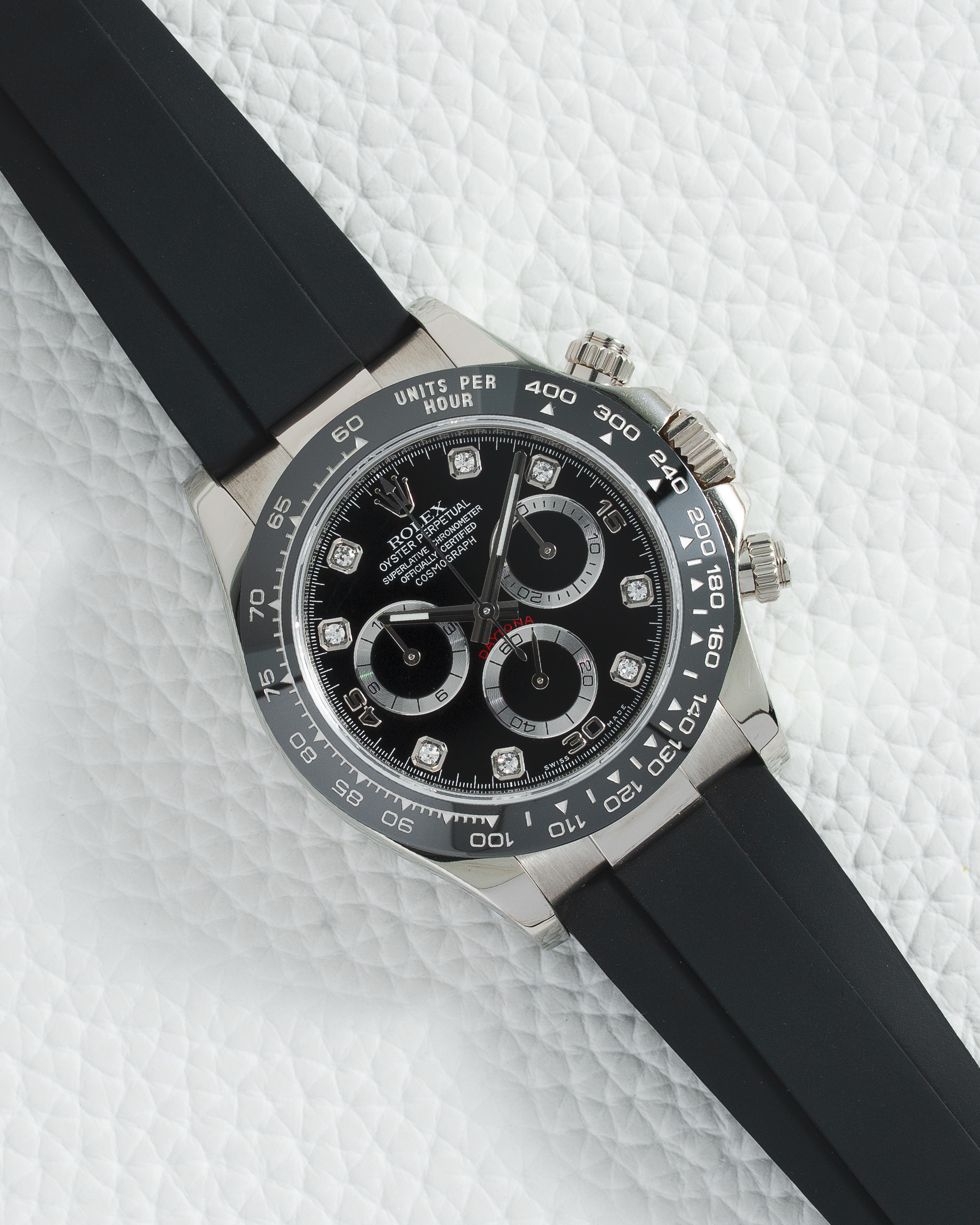 The Rolex Cosmograph Daytona 116519LN with its striking black diamond-paved dial and solid 18k white gold construction represents the absolute zenith of luxury chronograph design, blending iconic motorsport heritage with extraordinary haute joaillerie in a timepiece that transcends conventional watchmaking. This 40mm masterpiece features a case crafted entirely from Rolex’s white gold that offers a cool, substantial luxury, providing a brilliant backdrop for the breathtaking black dial meticulously set with baguette-cut black diamonds that create a mesmerizing tapestry of light and shadow with their subtle sparkle and sophisticated monochromatic aesthetic. The applied white gold hour markers and matching sub-dials at 3, 6, and 9 o’clock are strategically positioned to complement the diamond setting, all filled with Chromalight for exceptional luminosity in low-light conditions, while the Oysterflex bracelet combines the flexibility of black elastomer with a titanium and nickel alloy blade core and white gold folding clasp for a perfect, secure fit. Powered by Rolex’s Caliber 4130, a self-winding chronograph movement entirely developed and manufactured in-house, this watch delivers outstanding precision with a 72-hour power reserve and is certified as a Superlative Chronometer for remarkable accuracy. The tachymetric bezel in black Cerachrom ceramic offers scratch resistance and perfect visual harmony with the diamond dial. Every detail reflects Rolex’s obsessive attention to craftsmanship, from the screw-down chronograph pushers that ensure 100-meter water resistance to the flawless diamond setting where each black baguette diamond is meticulously selected and placed by master gem-setters for perfect alignment and brilliance. The 116519LN represents the ultimate expression of watchmaking meets high jewelry, offering a timepiece that transitions seamlessly from prestigious sporting events to exclusive red carpet occasions. With its breathtaking combination of precious materials, technical innovation, and unparalleled diamond craftsmanship, this Daytona stands as a testament to Rolex’s ability to create instruments that are both functionally exceptional and artistically magnificent – a true collector’s piece for those who demand the absolute finest in both mechanical excellence and diamond artistry, making it one of the most luxurious and sought-after chronographs in the world where every component speaks to Rolex’s unwavering commitment to perfection.