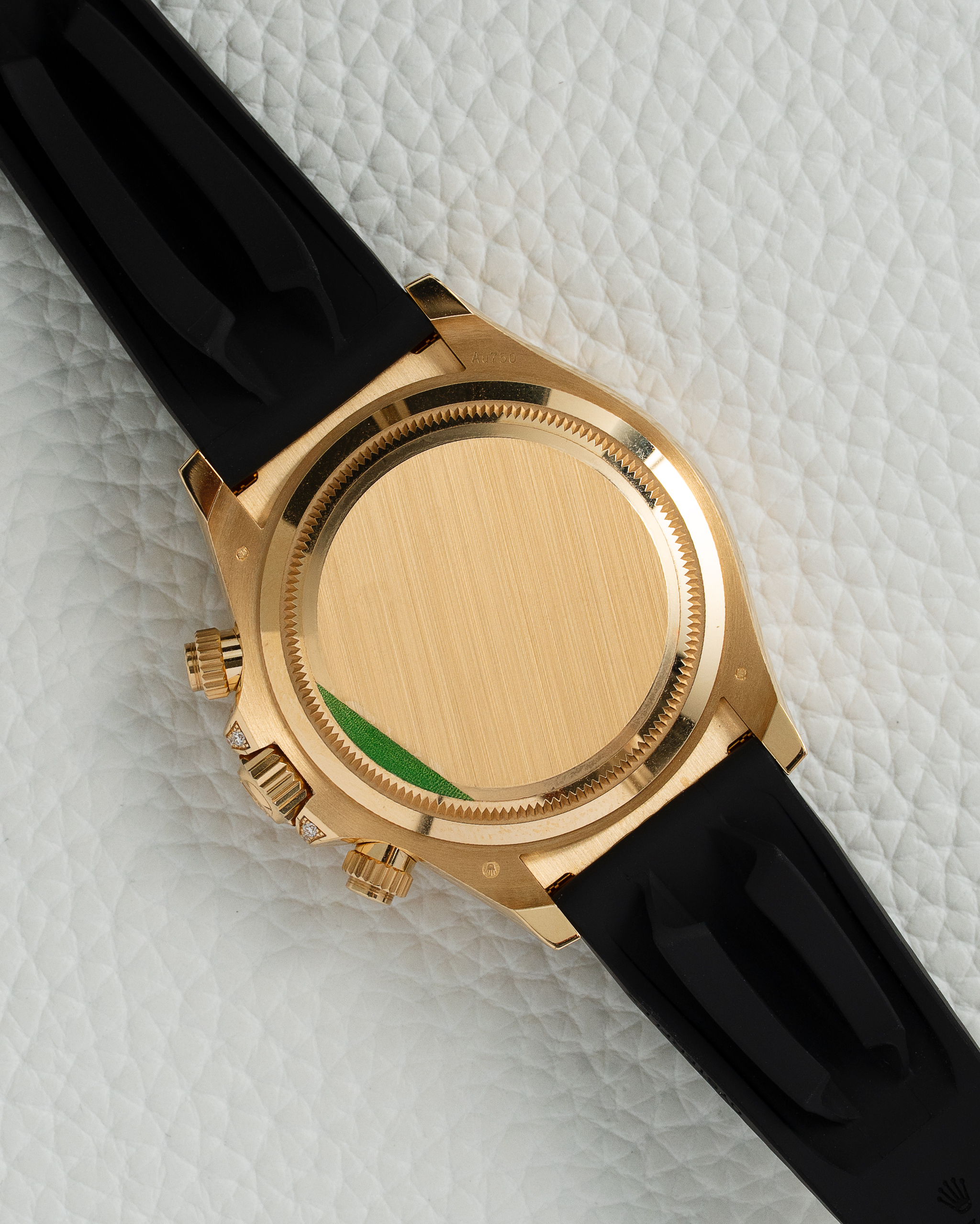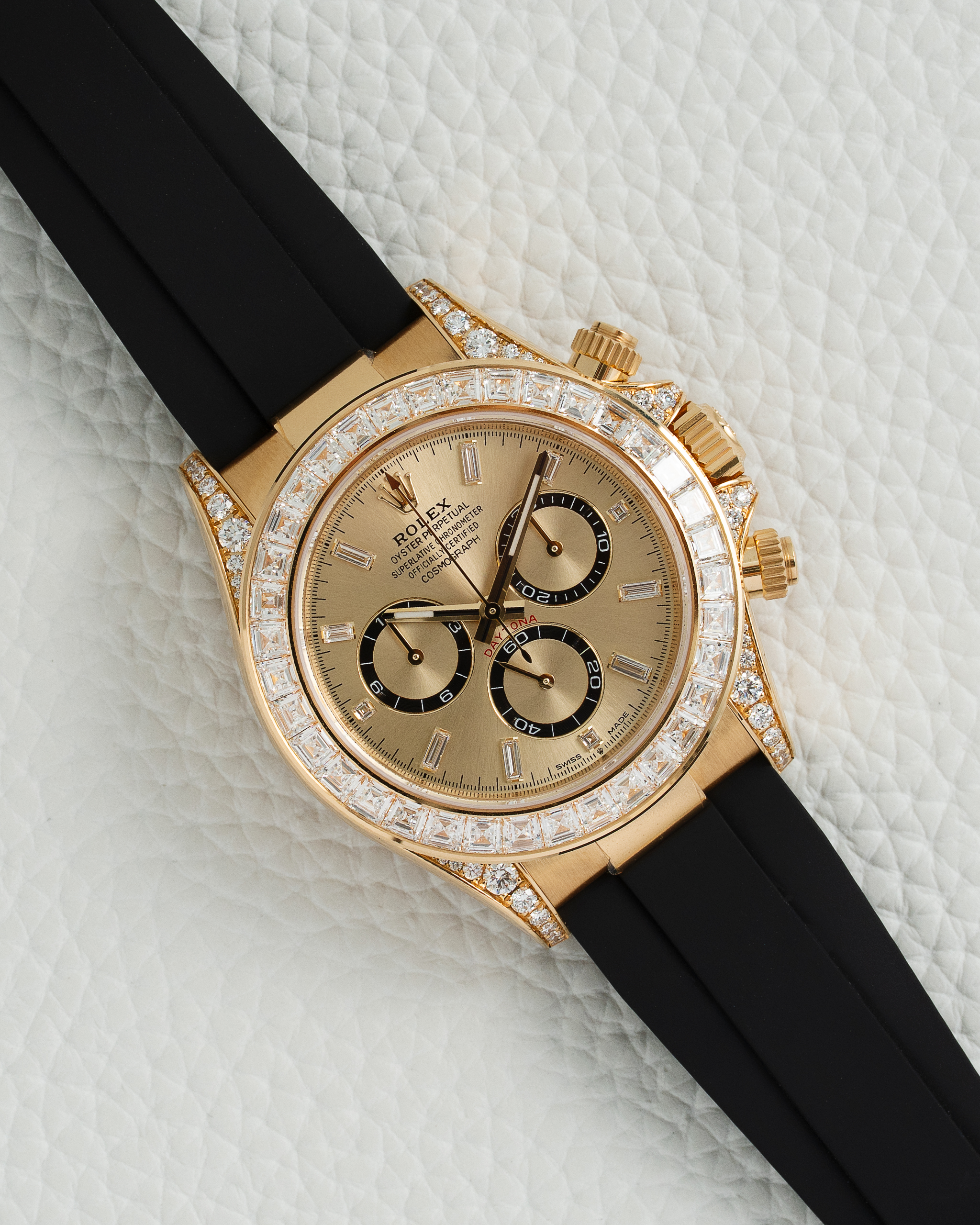 The Rolex Daytona 126538TBR is a breathtaking masterpiece of horological artistry and technical precision, designed for those who demand nothing less than extraordinary. This exceptional timepiece features a 40mm case crafted from luxurious 18k yellow gold, adorned with a dazzling bezel set with 36 meticulously graded baguette-cut diamonds that catch the light with every movement. The champagne-colored dial is a symphony of brilliance, featuring eight diamond hour markers complemented by three elegant sub-dials that maintain the Daytona’s iconic chronograph functionality while adding unparalleled opulence. The dial itself becomes a canvas of light with additional diamond accents, creating a mesmerizing play of sparkle that elevates this timepiece to jewelry status. Powered by Rolex’s in-house Caliber 4130, a self-winding mechanical chronograph movement renowned for its precision and reliability, this Daytona delivers exceptional performance with a 72-hour power reserve. The contrast of the rich yellow gold case against the sleek black Oysterflex rubber strap creates a striking modern aesthetic while ensuring comfortable wearability for any occasion. Every component reflects Rolex’s uncompromising standards, from the flawless diamond setting to the perfectly engineered movement visible through the sapphire crystal case back. The screw-down pushers and Triplock winding crown maintain the watch’s 100-meter water resistance, proving that even the most exquisite dress watch can retain robust functionality. This extraordinary Daytona variant represents the perfect marriage of Rolex’s sporting heritage and haute horlogerie, offering collectors a rare opportunity to own a timepiece that combines cutting-edge watchmaking with breathtaking diamond craftsmanship. Whether gracing a black-tie event or making a statement in everyday wear, the Daytona 126538TBR stands as a testament to what happens when supreme technical achievement meets uncompromising luxury, creating a watch that is as much a work of art as it is a precision instrument for measuring time.