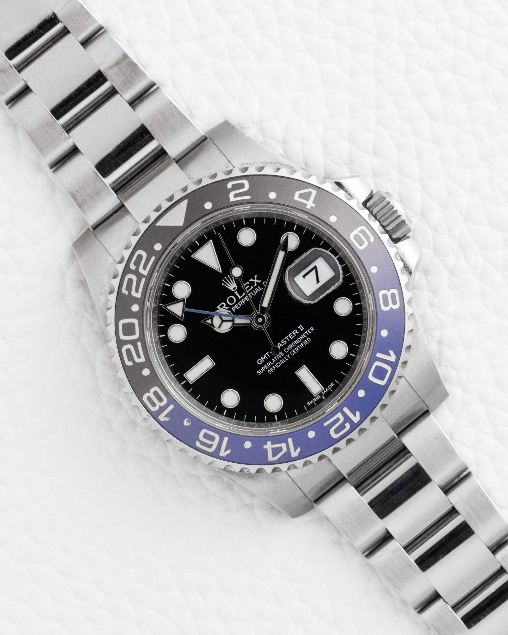 The Rolex GMT-Master II 126710BLNR affectionately known as the “Batman” among collectors is an iconic travel watch that masterfully blends professional functionality with sophisticated elegance featuring a 40mm Oystersteel case and the highly coveted Oyster bracelet that distinguishes it from its “Batman” counterpart. This exceptional timepiece showcases the striking two-tone Cerachrom bezel in deep blue and black ceramic a technological marvel achieved through Rolex’s proprietary manufacturing process that creates a seamless color transition while offering exceptional scratch and fade resistance. The classic black dial provides the perfect backdrop for the luminescent Chromalight hour markers and hands ensuring optimal legibility in any environment while the date window at 3 o’clock features the signature Cyclops magnification lens for enhanced readability. Powered by Rolex’s Caliber 3285 a next-generation movement with Chronergy escapement and 70-hour power reserve this watch is certified as a Superlative Chronometer delivering outstanding precision and reliability for the global traveler. The five-piece link Oyster bracelet offers superior comfort and a more refined aesthetic compared to the Oyster bracelet secured by the Oysterlock folding clasp with Easylink extension system for quick 5mm adjustments. As a true GMT watch it features an independent 24-hour hand and bidirectional rotatable bezel allowing effortless tracking of three time zones making it the ultimate companion for international journeys. Every detail reflects Rolex’s relentless pursuit of perfection from the scratch-resistant sapphire crystal to the hermetically sealed Oyster case providing 100-meter water resistance. The 126710BLNR represents the perfect synthesis of sporty functionality and dress-watch elegance offering unparalleled versatility that transitions seamlessly from adventure travel to formal occasions making it one of the most sought-after professional watches in Rolex’s catalog for those who demand both technical excellence and timeless style.