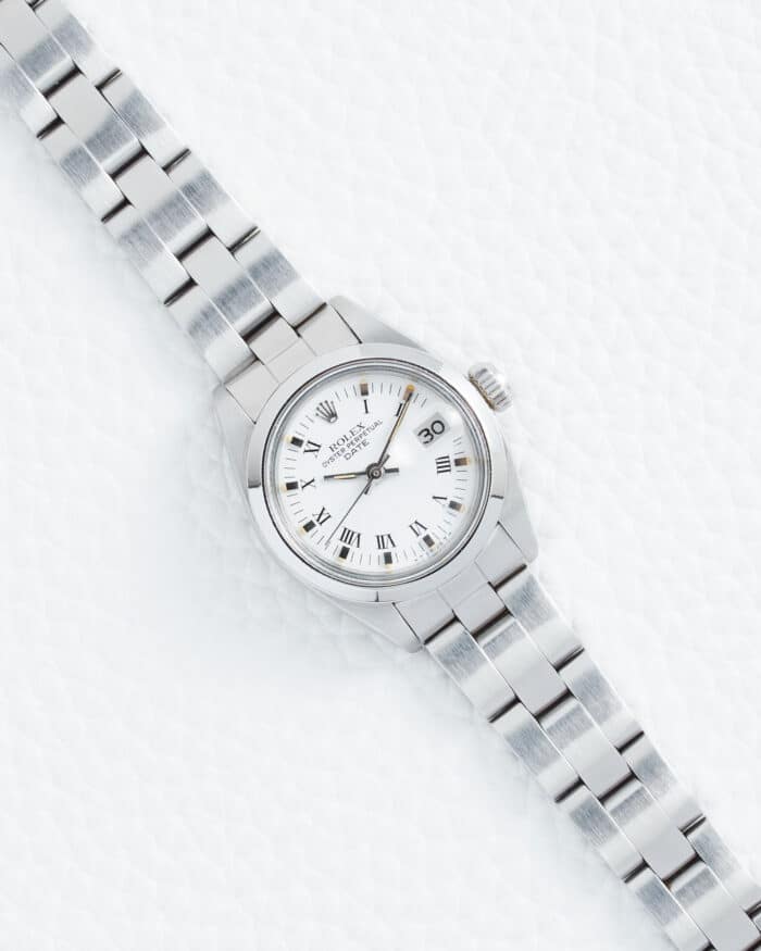 Theย Rolex Oyster Perpetual Lady Date 69160ย with itsย elegant white Roman numeral dialย andย stainless steel constructionย is a timeless and distinguished piece from the brand’s storied history, embodying the classic elegance and robust engineering that have defined Rolex for generations. Produced in the late 1970s and 1980s, this 26mm timepiece was designed as the perfect balance of feminine grace and everyday durability, featuring the iconicย waterproof Oyster caseโa pioneering innovation that helped establish Rolex as the benchmark for reliability . The watch is crafted fromย stainless steel, with its case characterized by clean, polished lines and aย smooth, domed bezelย that creates a sleek and understated profile .