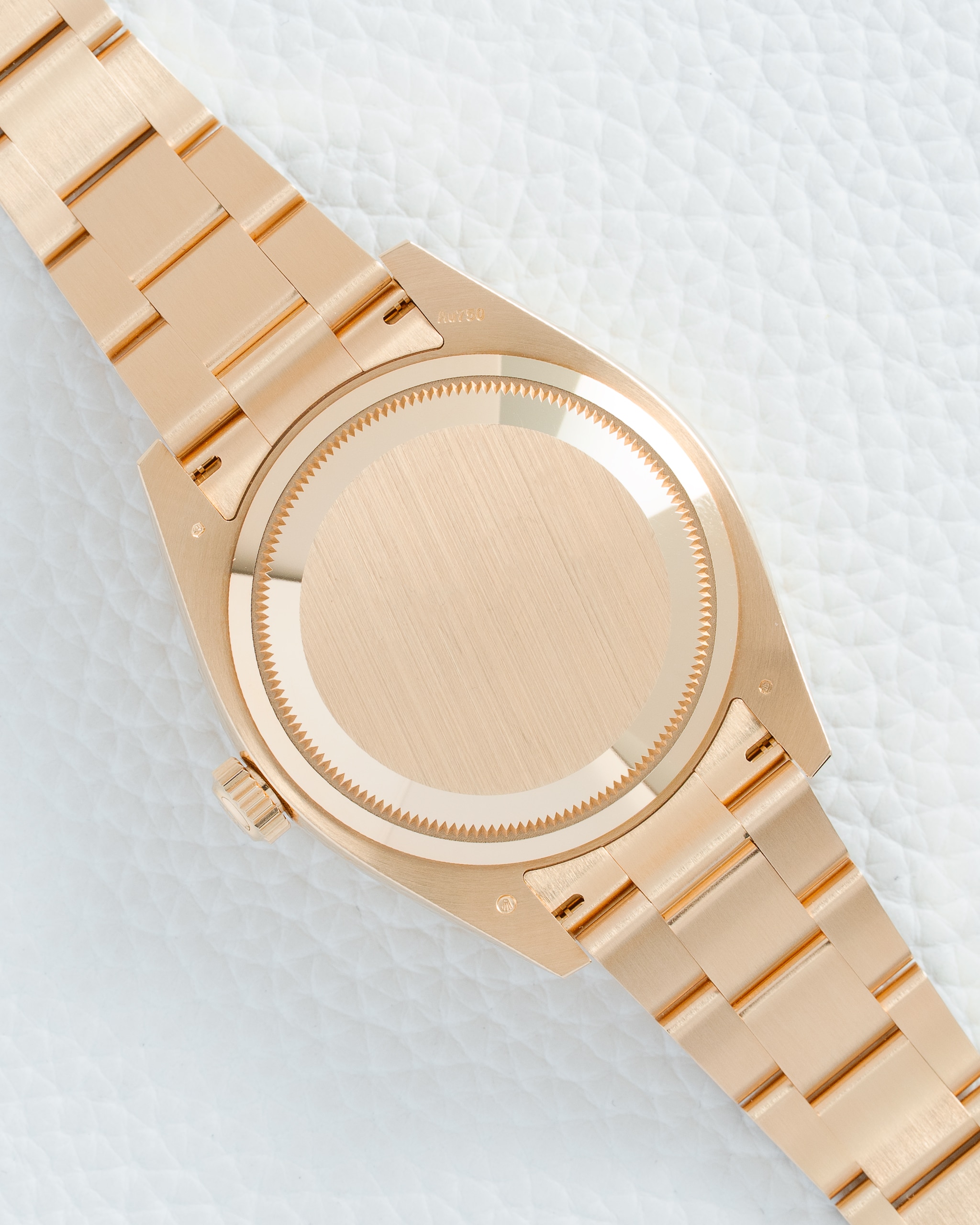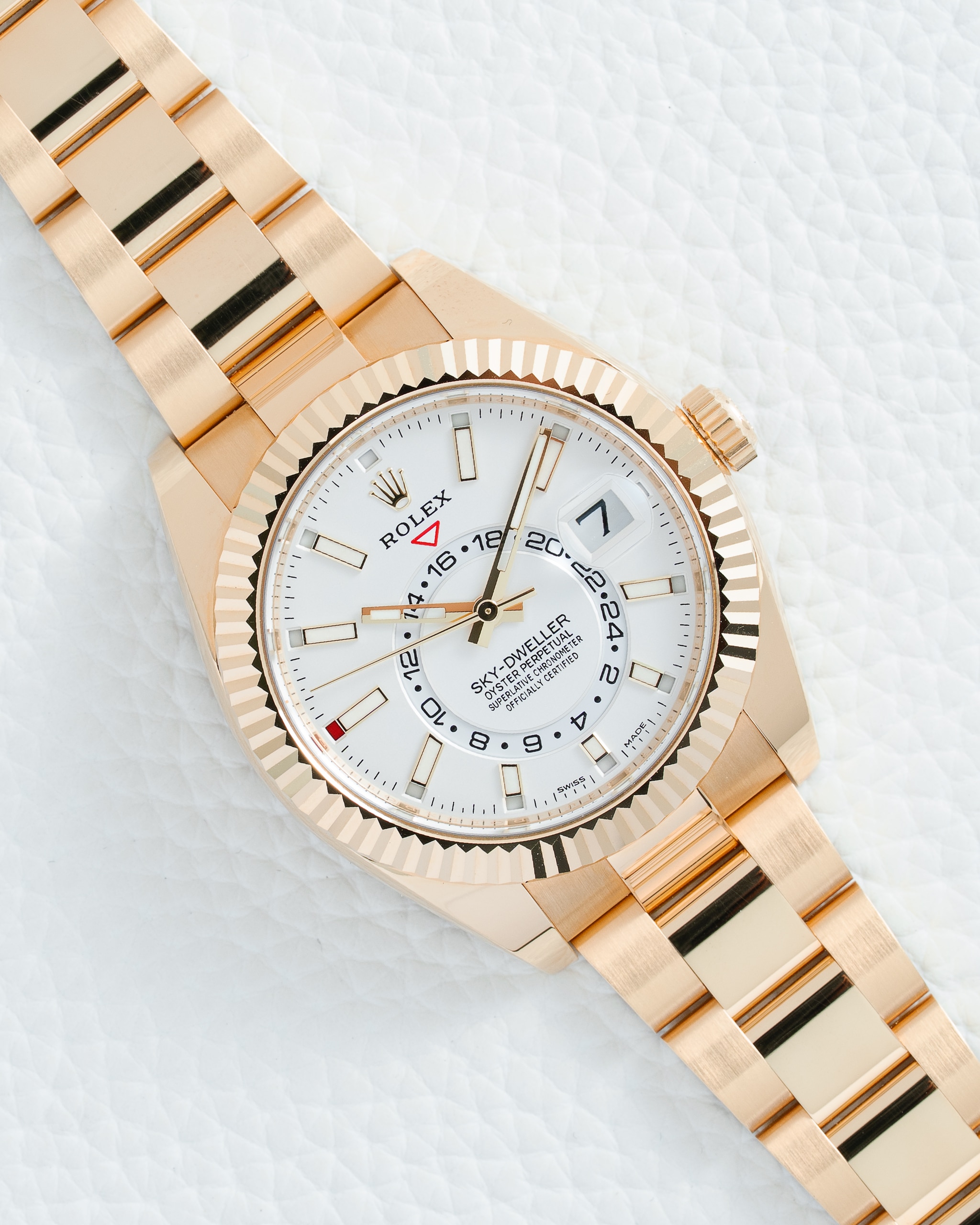 Theย Rolex Sky-Dweller Ref. 326938ย inย solid 18K yellow goldย withย white dialย represents the pinnacle of luxury travel watchmaking, featuring aย commanding 42mm caseย andย matching President braceletย crafted entirely from Rolex’s proprietary 18K yellow gold alloy that maintains its rich, warm luster indefinitely, paired with aย striking white sunburst dialย that provides perfect contrast for theย luminescent Chromalight handsย andย applied gold hour markersย for exceptional legibility across time zones. Powered by Rolex’s most complex movement, theย Caliber 9001, thisย COSC-certified Superlative Chronometerย deliversย 72-hour power reserve,ย ยฑ2 seconds/day accuracy, and anย innovative annual calendar (“Saros” system)ย that automatically differentiates between 30 and 31-day months, all protected byย 100-meter water resistanceย and aย scratch-resistant sapphire crystalย with Cyclops magnification. Theย fluted yellow gold bezelย doubles as theย Ring Command systemโallowing intuitive adjustment of all functions through simple rotationsโwhile theย President braceletย with its semi-circular links andย concealed Crownclaspย ensures both supreme comfort and seamless elegance. Designed for the global connoisseur, this Sky-Dweller features anย off-center 24-hour discย for intuitive second timezone tracking and aย date window at 3 o’clock, combining technical sophistication with user-friendly operation in a precious metal package. Presented in Rolex’s signature green packaging, this solid gold masterpiece transcends functionality to become a powerful symbol of achievement, offering discerning travelers unparalleled horological innovation wrapped in the warmth of yellow gold.ย Key specifications:ย 42mm solid 18K yellow gold case and President bracelet; white sunburst dial; Caliber 9001 automatic movement; 72-hour power reserve; annual calendar and dual timezone functions; 100m water resistance; sapphire crystal with Cyclops; Ring Command bezel.