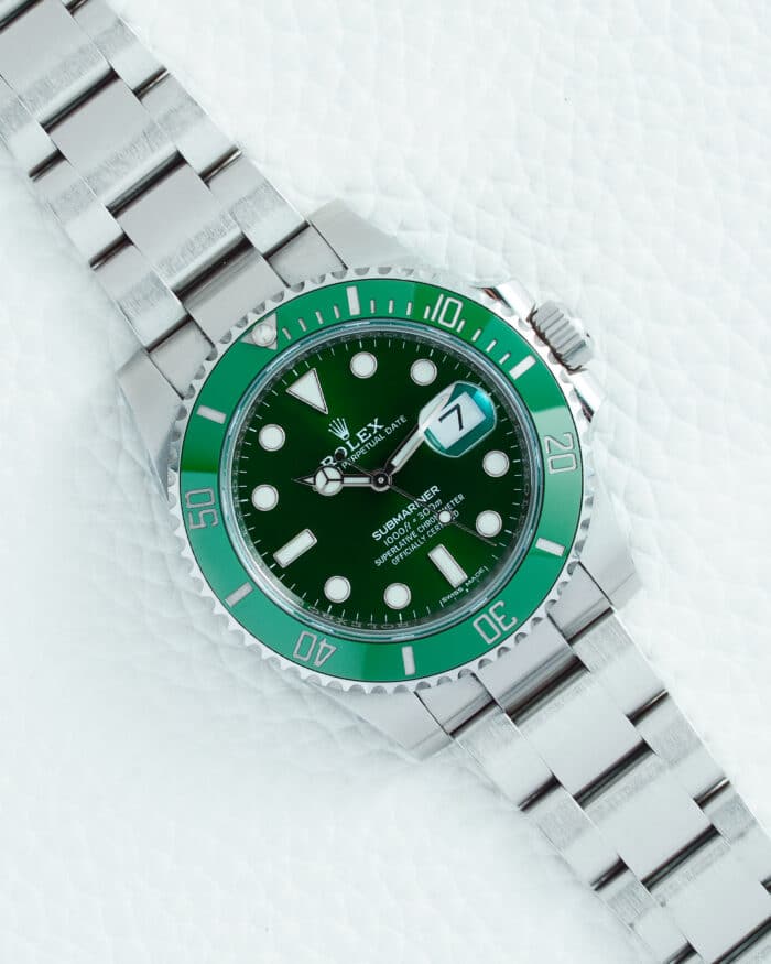 Theย Rolex Submariner Date 116610LVย affectionately known as the “Hulk” among collectors is an iconic dive watch that combines professional functionality with striking aesthetics through itsย vibrant green dial and matching green Cerachrom bezelย in a robust 40mm stainless steel case. This legendary timepiece features Rolex’sย maxi case designย with broader lugs and crown guards that give it a more substantial presence on the wrist while maintaining the Submariner’s classic proportions. Theย rich green dialย undergoes a sunray finishing process that creates a dynamic play of light ranging from deep forest green to brilliant emerald depending on the angle while theย oversized Chromalight hour markers and Mercedes handsย provide exceptional luminosity in low-light conditions. Theย unidirectional rotatable bezelย is crafted fromย scratch-resistant green ceramicย with platinum-coated numerals representing a significant technological achievement in ceramic manufacturing when introduced. Powered by Rolex’sย Caliber 3135ย a self-winding movement withย Paramagnetic blue Parachrom hairspringย andย 48-hour power reserveย this watch is certified as aย Superlative Chronometerย for outstanding accuracy and reliability. Theย Oyster braceletย featuresย solid linksย and theย Glidelock extension systemย allowing tool-free adjustments for perfect fit over a wetsuit while theย Oysterlock folding claspย ensures security during diving activities. Every component meets professional diving standards from theย scratch-resistant sapphire crystalย to theย hermetically sealed Oyster caseย that providesย 300-meter water resistanceย and theย triple-sealed screw-down crown. Theย 116610LVย represents a bold yet sophisticated interpretation of the Submariner legacy offering a unique colorway that has become one of the most sought-after modern Rolex references among collectors and enthusiasts alike. With its perfect balance ofย tool-watch functionality and distinctive styleย this Submariner “Hulk” stands as a testament to Rolex’s ability to innovate while honoring its diving heritage creating a timepiece that is both technically exceptional and visually unforgettable.