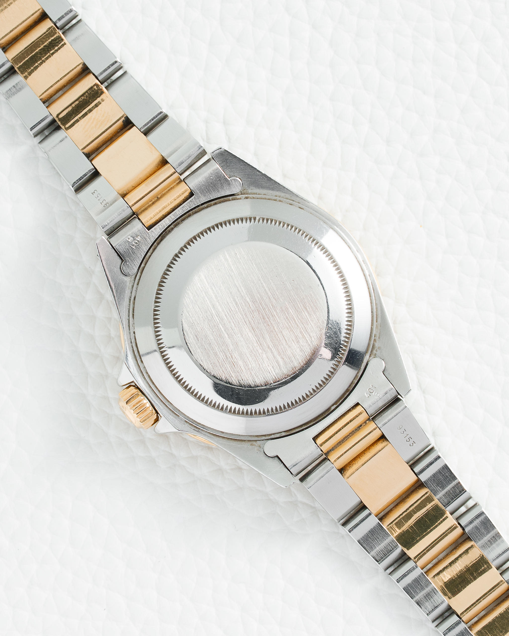 The Rolex Submariner Date 16613 with its classic black dial and two-tone yellow gold and steel construction represents an iconic chapter in dive watch history, blending professional functionality with luxurious aesthetics in a 40mm timepiece that has become one of the most sought-after vintage references among collectors. This legendary model features a stainless steel case complemented by 18k yellow gold crown guards and a matching yellow gold bezel with a black aluminum insert that has developed a desirable patina over time, creating a warm, vintage character against the deep black gloss dial. The luminous Tritium hour markers and Mercedes hands offer a charming vintage glow that has aged to a soft cream color, while the date window at 3 o’clock features the signature Cyclops magnification lens for enhanced readability. Powered by Rolex’s Caliber 3135, a self-winding movement with 48-hour power reserve, this watch is a COSC-certified chronometer known for its robustness and reliability that defined an era of Rolex engineering. The Oyster bracelet masterfully combines stainless steel links with 18k yellow gold center links, secured by a folding Oysterlock clasp that ensures security and comfort. Every detail reflects Rolex’s unwavering commitment to quality for its time, from the scratch-resistant sapphire crystal to the hermetically sealed Oyster case that provides 300-meter water resistance and the triple-sealed screw-down crown. The 16613 embodies the perfect harmony of tool-watch heritage and two-tone luxury, offering a watch that transitions seamlessly from underwater exploration to formal occasions, representing the golden era of Submariner design that balanced rugged capability with refined style. With its combination of precious materials, timeless design, and proven reliability, this Submariner stands as a symbol of achievement and sophistication for those who appreciate vintage Rolex excellence – a true collector’s item that has appreciated significantly in value while maintaining the charm and character that modern watches often lack, making it a cornerstone piece for any serious collection of iconic timepieces.