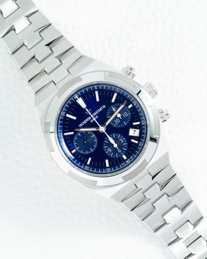Theย Vacheron Constantin Overseas 5500Vย with itsย iconic blue dialย andย stainless steel constructionย represents the pinnacle of luxury sports watchmaking, blending the Maison’s 265 years of Genevan watchmaking heritage with contemporary design and functionality in a 42.5mm timepiece that epitomizes refined elegance and versatility. This exceptional model features aย stainless steel caseย with the Overseas’ signatureย hexagonal bezelย inspired by the Maltese cross, meticulously finished with alternating polished and satin-brushed surfaces that create a captivating play of light, while theย sunburst blue dialย transitions from deep navy to vibrant azure depending on the angle, providing a stunning backdrop for theย applied white gold hour markersย andย handsย filled with luminescent material for optimal readability. Theย annual calendar complicationย elegantly displays theย day, date, and monthย through three apertures at the top half of the dial, demonstrating Vacheron Constantin’s mastery of sophisticated horology in a sporty context. Powered by theย automatic Caliber 5200, this in-house movement features aย 22k gold oscillating weightย and offers an impressiveย 52-hour power reserve, beautifully finished with Cรดtes de Genรจve and perlage decorations visible through the sapphire crystal caseback. The Overseas collection’s innovativeย quick-release systemย allows for effortless interchangeability between theย integrated stainless steel bracelet, aย blue rubber strap, and aย blue alligator leather strap, all included with the watch, enabling seamless transformation from sporty to elegant wear. Every detail reflects Vacheron Constantin’s uncompromising standards of theย Poinรงon de Genรจveย certification, from theย anti-reflective sapphire crystalย to theย 150-meter water resistanceย and theย exquisite finishingย on every component. Theย 5500Vย embodies the perfect synthesis ofย haute horlogerie complexity and luxury sports watch versatility, offering a timepiece that transitions effortlessly from casual outings to formal occasions while showcasing the technical excellence and aesthetic refinement that have established Vacheron Constantin as one of the world’s most prestigious watchmakers for discerning collectors who appreciate both mechanical artistry and understated elegance.