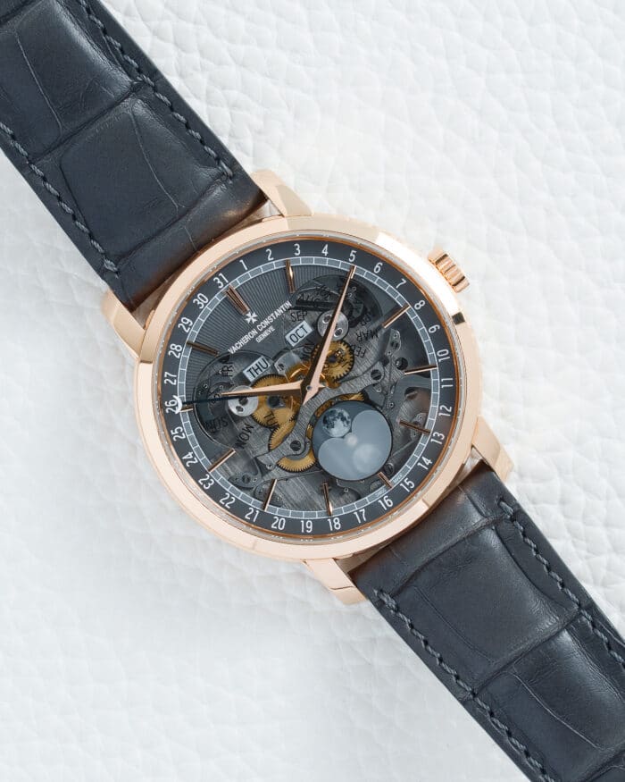 Theย Vacheron Constantin Traditionnelle Complete Calendar Openface Ref. 4020T/000R-B654ย is a breathtaking fusion of classical Genevan watchmaking and contemporary architectural design, offering a captivating view of its mechanical heart through a unique, multi-layered openworked sapphire dial that reveals the intricate Calibre 2460 QCL/2 beneath, whose main plate and bridges are highlighted by a sophisticated anthracite NAC treatmentย . This strikingย 41mm 18K rose gold case, with its slim bezel and stepped flanks, measures 11.05mm in thickness and provides a warm, luxurious frame for the dial’s complex visual depthย . The dial itself is a masterclass in layering: a slate grey opaline chapter ring displays the date numerals and a railroad minutes track, while the partially transparent construction allows full visibility of the sapphire day and month discs below the 12 o’clock position and the precision moon phase indicator at 6 o’clock, featuring a photo-realistic depiction of the moon against a smoked grey backgroundย . Powered by theย in-house automatic Calibre 2460 QCL/2, this movement comprises 312 meticulously finished parts, beats at a frequency of 28,800 vibrations per hour, and delivers aย 40-hour power reserveย . The exquisite finishing, worthy of the prestigiousย Hallmark of Geneva, includes Geneva striping on the bridges and perlage on the baseplate, all visible through the sapphire crystal caseback, which also showcases the 22K rose gold rotor with a skeletonized Maltese cross designย . The watch is secured by a luxuriousย grey alligator leather strapย with a matching 18K rose gold pin buckle, and offers a water resistance of 30 meters (3 bar)ย . This timepiece represents the perfect harmony of Vacheron Constantin’s centuries-old heritage and a modern, openworked aesthetic, appealing to connoisseurs who seek both horological substance and visual artistry.ย Key specifications:ย 41mm 18K rose gold case; openworked sapphire dial with slate grey opaline chapter ring; in-house automatic Caliber 2460 QCL/2 with complete calendar (day, date, month) and precision moon phase; 40-hour power reserve; grey alligator strap with 18K rose gold pin buckle; 30m water resistance; sapphire crystal front and back; Hallmark of Geneva certifiedย .