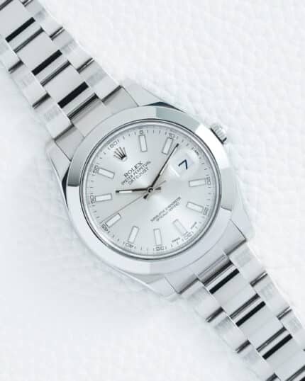 The Rolex Datejust II 41 Ref. 116300 with its timeless silver stick dial, smooth bezel, and classic Oyster bracelet is a distinguished and versatile expression of